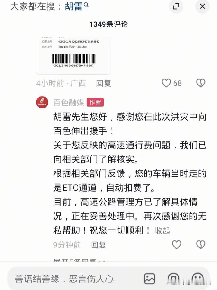 胡雷这次援助广西高速扣费的事,我觉得就是胡雷还没搞清楚情况就在抹黑广西,社会力量救援车辆信息报备后,自己走的ETC自动扣费通道,而不是人工通道。事后也没跟相关方核查问题原因就发视频说当地高速管理处刁难他。我相信一个高速公路部门不可能枉顾国家规定,没必要黑他这一千多块钱。看“百色融媒”的评论,事情根本就不是他说的那样。既然他做慈善援助这么多年,如果高速部门真的违规扣费了,一个举报电话就解决了的事,为什么要发视频出来,给人一种“欺压”他的感觉。而且那段时间社会救援车辆肯定不止他一辆,难道那个收费站单单坑他的钱吗?