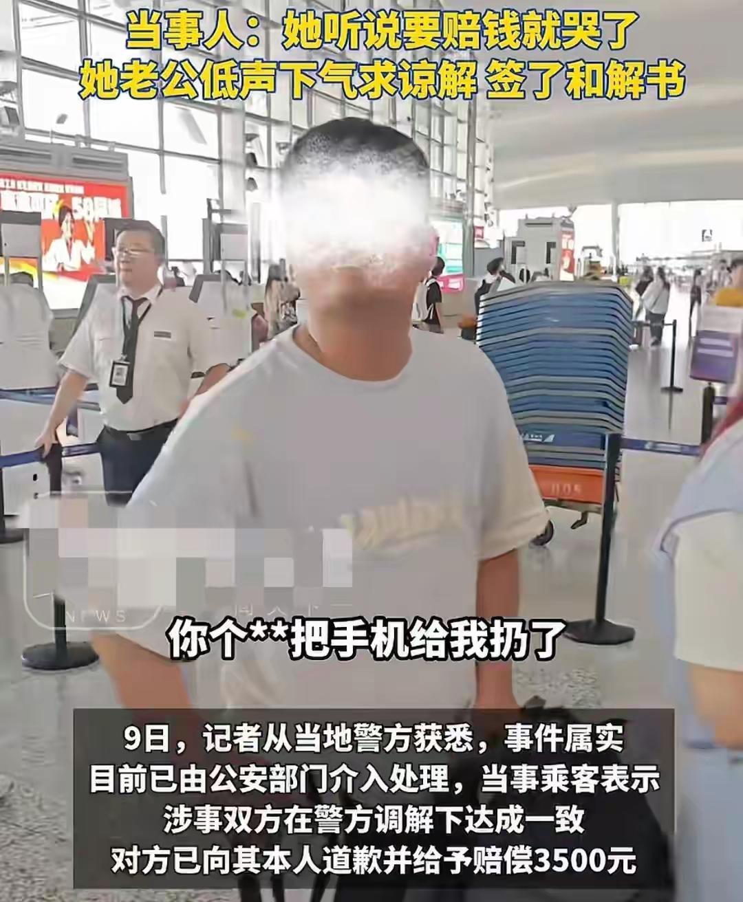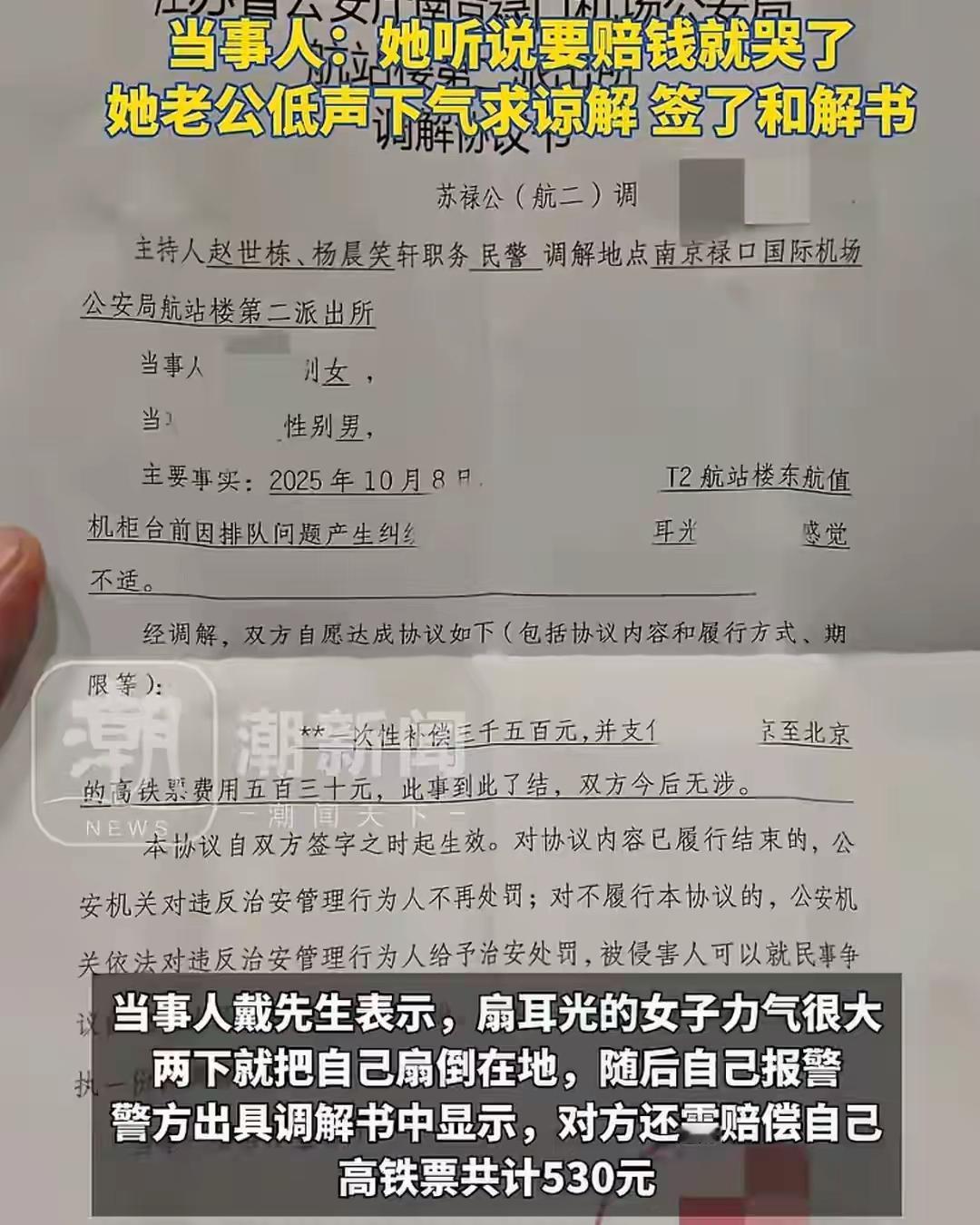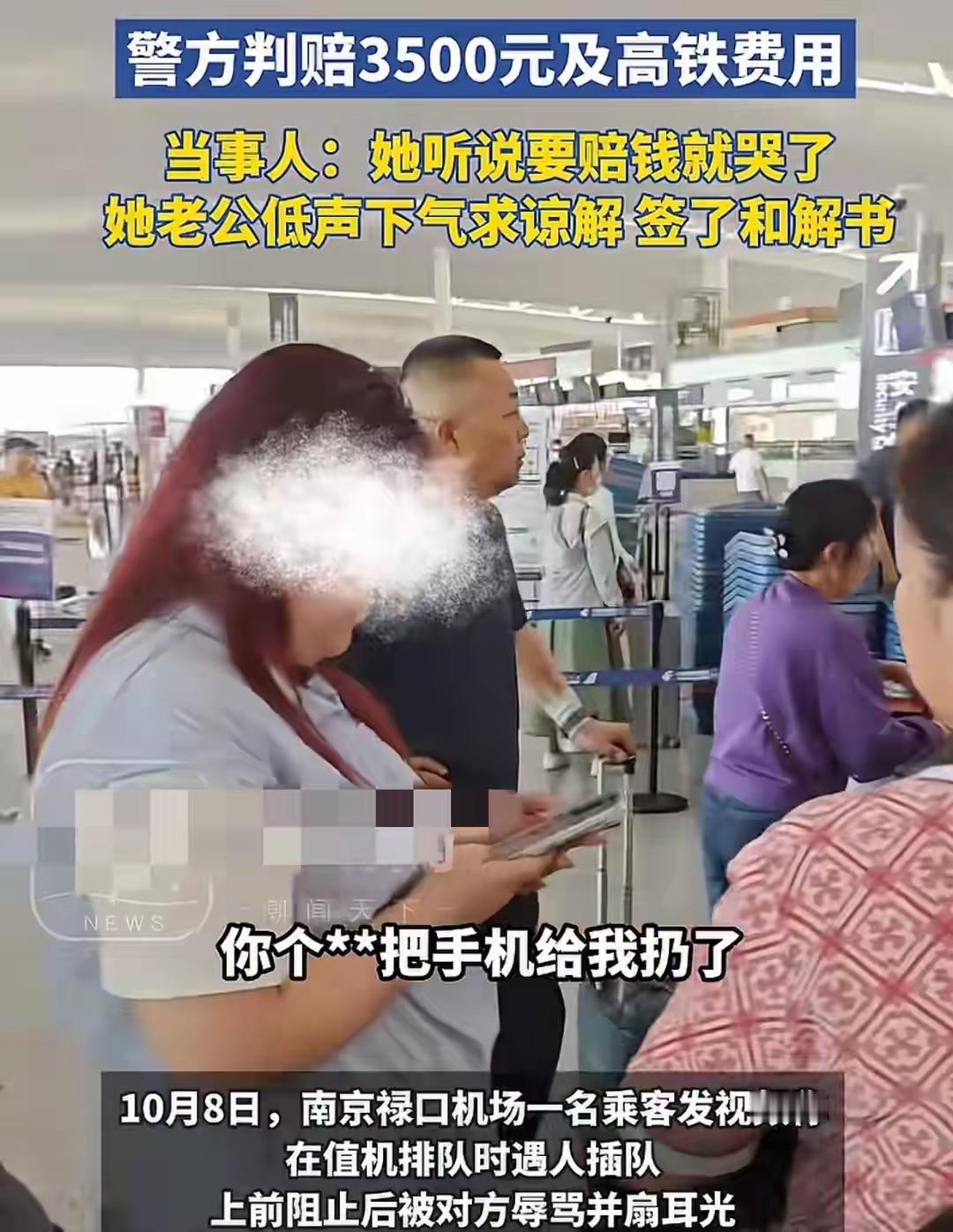 男子在南京机场被女子扇耳光后续,警方介入,女子听到赔钱被吓哭 南京禄口机场值机时,戴先生阻止一家四口插队,反遭对方围堵辱骂,女子更是两耳光将他扇倒在地。 报警后,警方介入调解,明确涉事方需赔偿3500元医疗费及高铁改签费。刚才还嚣张的女子一听要赔钱,当场嚎啕大哭,丈夫也立刻低声下气求谅解签和解书。 真是打人时有多横,赔钱时就有多怂。