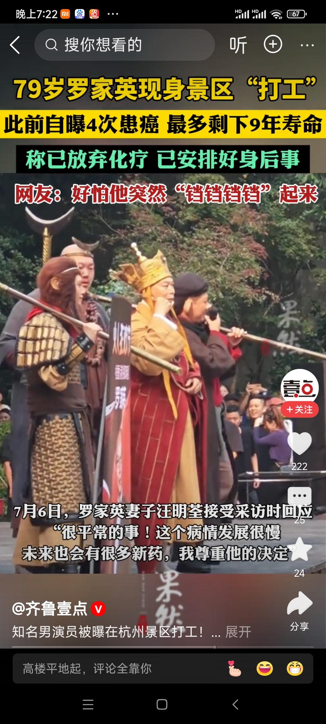 《赞罗家英景区务工》 古稀戏骨踏尘烟, 景区躬身任暑寒。 莫道银须辞粉墨, 勤心