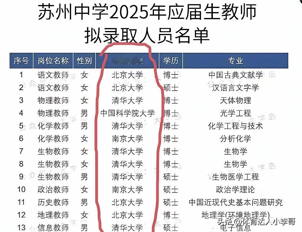 苏州中学这么人才辈出是有原因的。大家看一看今年苏州中学招收了多少清华大学和北京大学的博士,全部是985,全部是C九联盟,有这么好的老师,再加上学生的成绩这么优秀,怎么可能出不了大师呢?自古以来苏州都非常重视教育,这也是为什么很多家长愿意让孩子在苏州接受教育的原因,因为他这儿有这样的土壤,有这样的环境,所以大家对于这边儿的教育非常重视,如果你有机会,有能力,有本事,请一定想办法让你的孩子在苏州读书,虽然说人家说江苏也是地狱模式,但是在这边儿教育出来的孩子是实打实的学霸,将来在这里就业工作呀,生活在这边儿都是不错的选择!