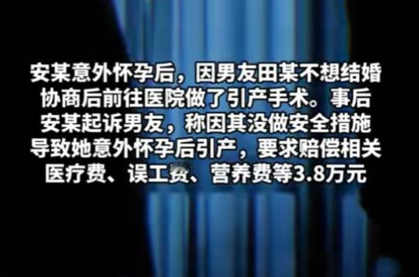 女子意外怀孕因男方不想结婚协商后做了引产手术,事后女子起诉男友称因其没做安全措施导致,要求赔偿3.8万! 网友评论:应该说两个人的感情还是挺好的!第一次怀孕男孩不想结婚,可能和事业、年龄有关。起诉说的家暴,可能也只是推推搡搡。这不,和好了,又怀孕了,准备结婚。提前祝你们新婚快乐、百年好合、白头到老! 女人遭罪了伤身体了,经济损失就应该男人完全承担。 怀孕了,矛盾,家暴,不愿承担责任。流产,起诉。然后又怀孕。 事儿是两个人做的,后果却是女的一方承担,这世道呀,所以女孩子一定要爱惜自己。