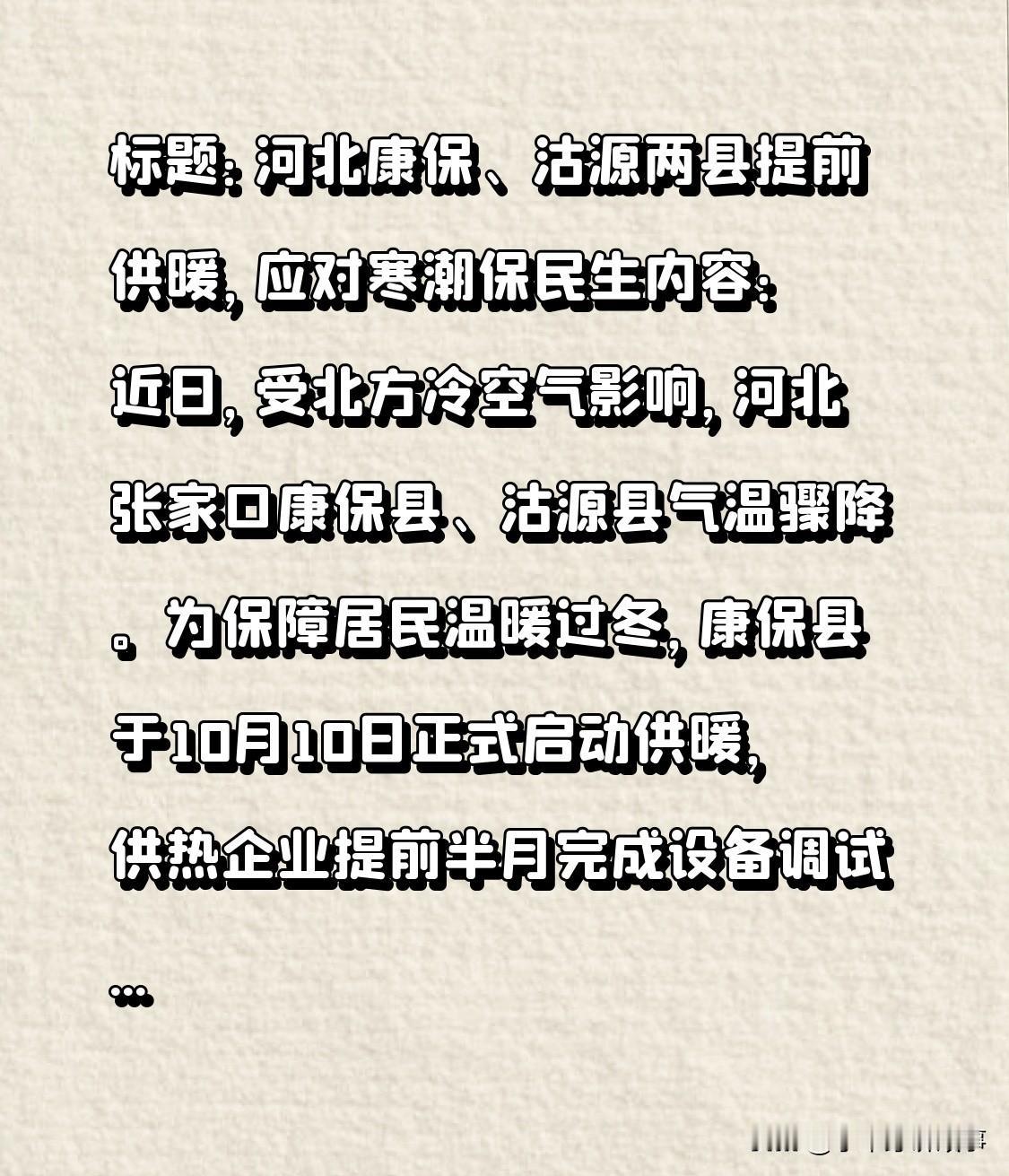 惊讶!标题:河北康保、沽源两县提前供暖,应对寒潮保民生 近日,受北方冷空气侵袭,河北张家口康保县、沽源县气温急剧下降。为让居民温暖过冬,康保县10月10日开启供暖,供热企业提前半月完成设备调试;沽源县10月3日提前点火预热,10日同步送暖,供暖至次年4月25日。两县行动获网友点赞。❄️🔥