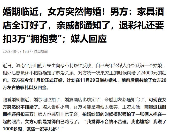 河南平顶山,大龄青年万先生,经媒人介绍,与女友订婚,给了20万彩礼和4金。结婚日子都定了,婚纱照也拍了,亲戚也通知了,结果临结婚前,女友悔婚,觉得万先生太老实,工资低。在随后的彩礼退还过程中,双方却发生了难以调和的矛盾,尤其是在彩礼退款金额上产生了巨大争议。女方要求扣除3万元“拥抱费”,让万先生陷入了困惑和无奈。就连媒人都看不过去,认为女方家不地道。 万先生,已经30多了,迟迟未婚,家庭为其安排了相亲,经过一段时间的了解后,万先生与女友通过媒人认识并迅速建立了恋爱关系。两人约定于2025年1月订婚,并按传统风俗进行了婚纱照拍摄、婚宴酒店预定及邀请函发放等安排。 然而,在婚期临近时,万先生的女友突然表示不再愿意结婚。面对女友的反悔,万先生自然不甘心,他提出要求退还已经支付的20万元彩礼。经过多次沟通,女方同意退还彩礼,但附加了一个令人费解的条件:扣除3万元的“拥抱费”,理由是拍婚纱照时,万先生在摄影师的要求下搂抱了她,这样的举动“玷污了她的清白”,对她的声誉造成了影响。 对于这一要求,万先生深感困惑,认为自己在拍照时的行为完全是受摄影师的安排,且当时女方也并未表示反对。女方的要求似乎毫无依据,但却不断强调3万元的扣除费用,甚至提出该金额还包括了两人恋爱期间的所有开销,例如吃饭、看电影等日常花费。 最终,经过一番争执和调解,双方达成了一个“妥协”方案,女方退还了170,500元彩礼,婚事彻底宣告破裂。 根据《民法典》第1091条的规定,彩礼属于赠与性质的财产转移。在婚姻关系中,彩礼通常是由男方支付给女方家的一笔款项,旨在体现男方对婚姻的承诺与诚意。然而,彩礼的返还问题在我国民法体系中一直是争议的焦点。 《民法典》对彩礼的返还做出了明确规定,特别是在《民法典》婚姻家庭编的司法解释第5条中指出:“当事人请求返还按照习俗给付的彩礼的,如果查明属于以下情形,人民法院应当予以支持:(一)双方未办理结婚登记手续;(二)双方办理结婚登记手续但确未共同生活;(三)婚前给付并导致给付人生活困难。” 在本案中,万先生与女友并未办理结婚登记手续,且两人并未共同生活,因此符合《民法典》第1091条的返还条件。万先生完全有权要求退还全部彩礼,女方的拒绝或扣除彩礼的行为明显不符合法律规定。 至于女方要求从彩礼中扣除3万元“拥抱费”,这一要求似乎完全没有法律依据。首先,根据万先生的描述,拍婚纱照时的拥抱行为是由摄影师要求的,且女方当时并未反对。根据《民法典》第657条的规定,赠与合同是指赠与人将自己的财产无偿赠与受赠人,并且受赠人表示接受赠与。若万先生在婚纱照拍摄时赠与的并非出于恶意,而是作为婚礼准备的一部分,这种行为显然不应当附加任何惩罚性费用。 女方称万先生的“拥抱”行为损害了其声誉,并提出扣除“拥抱费”,这种行为并没有法律支持。法律上,并未对恋爱或婚姻过程中某一方的行为设定类似的费用条款,除非有明确证据显示某一方故意或恶意伤害了另一方的声誉或权益。 在案件中,万先生为女友购买了电脑和手表,这些物品是否应当返还,涉及到赠与与附条件赠与的问题。根据《民法典》第657条规定,赠与是指赠与人将财产无偿赠与他人,而受赠人接受的行为构成赠与的成立。 如果万先生赠送的电脑和手表是出于结婚的目的,则其赠与行为可能属于附条件赠与,即这些赠与行为是为实现婚姻关系而进行的。如果婚姻关系未能成立,赠与的条件不成立,那么万先生有权要求女方返还这些物品。此时,女方如果不予返还,则可能构成不当得利。 然而,在本案中,万先生未能提供充分的证据表明这些物品是为了婚姻而赠送的,因此能否要求返还仍需进一步考虑。 这起案件不仅涉及到彩礼返还的问题,也反映出在现代社会中婚姻观念与传统习俗之间的冲突。尽管现代社会提倡男女平等,倡导理性婚姻观,但在实际操作中,彩礼仍然是许多婚姻中不可回避的因素。 对于广大未婚人士来说,婚前的财产赠与应当明确目的和条件,避免产生法律上的不确定性。通过明确的协议与证据,可以有效避免类似纠纷的发生。而对于彩礼这一传统现象,法律的介入也应当进一步明确其法律属性,确保其不被滥用。 此外,婚姻中的情感纠纷,也应当理性处理。任何一方的情感反悔都不应成为诉诸暴力、索取不合理利益的理由。在婚姻的法治框架下,法律应保护双方的基本权益,防止因婚姻不成立导致的无理要求和不公正待遇。