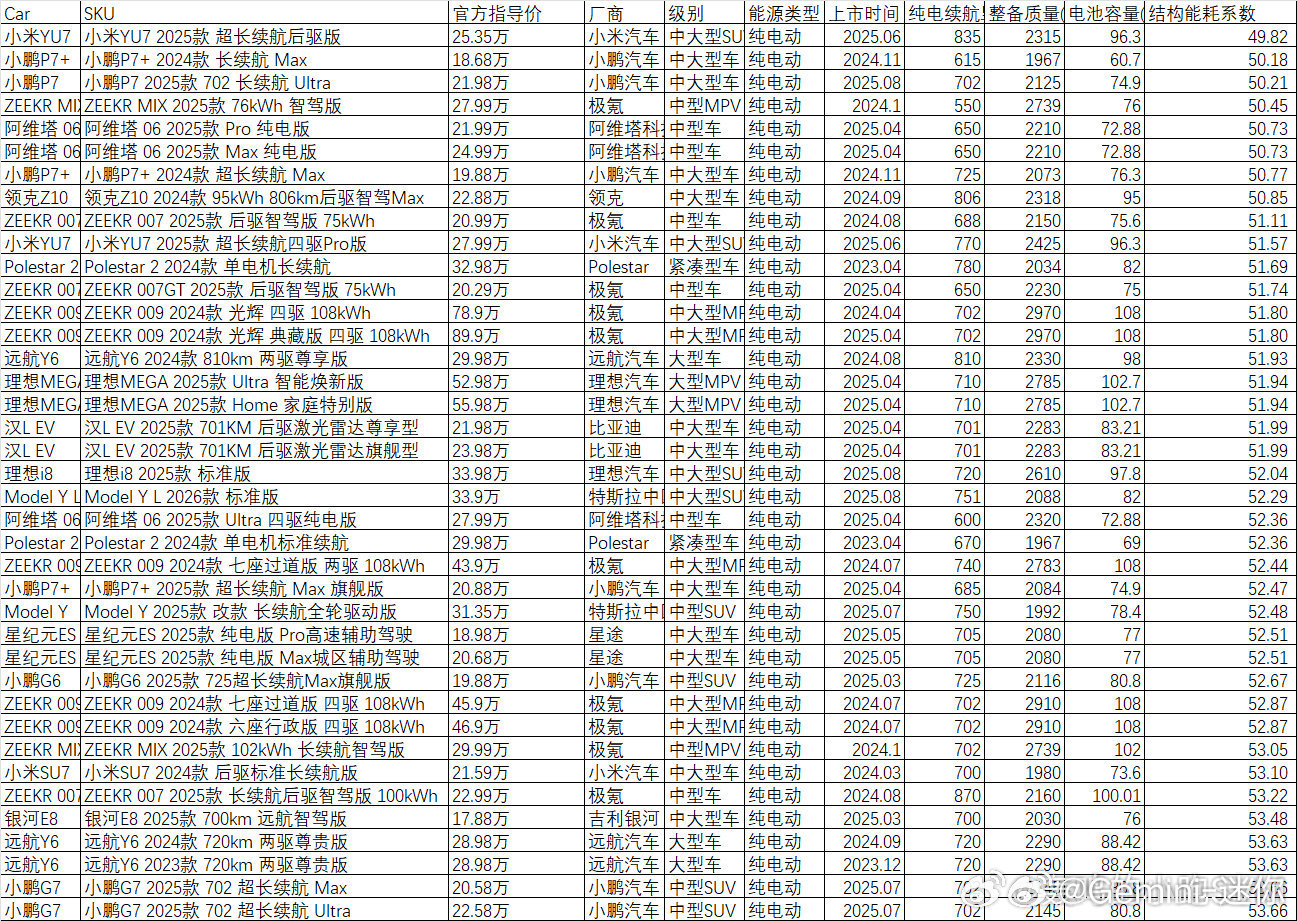根据跑工定义的“单位质量运送单位距离需要消耗多少度电”的指标,特斯拉的能耗真的不算亮眼