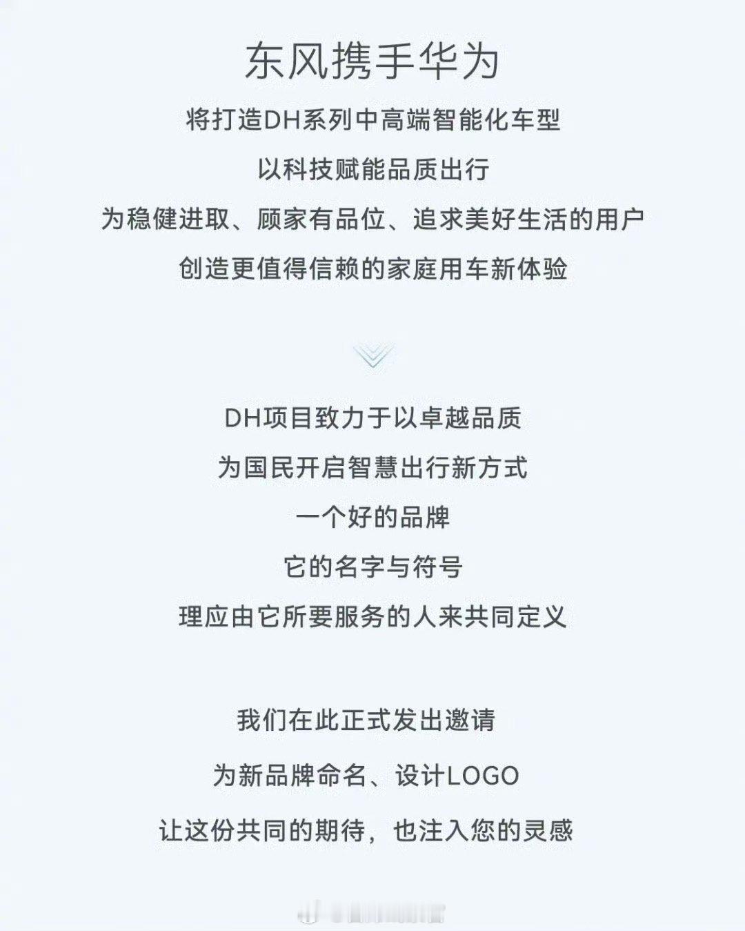 东风奕派向网友发出邀请,为东风、华为打造的 DH 项目征集中文名和 LOGO。