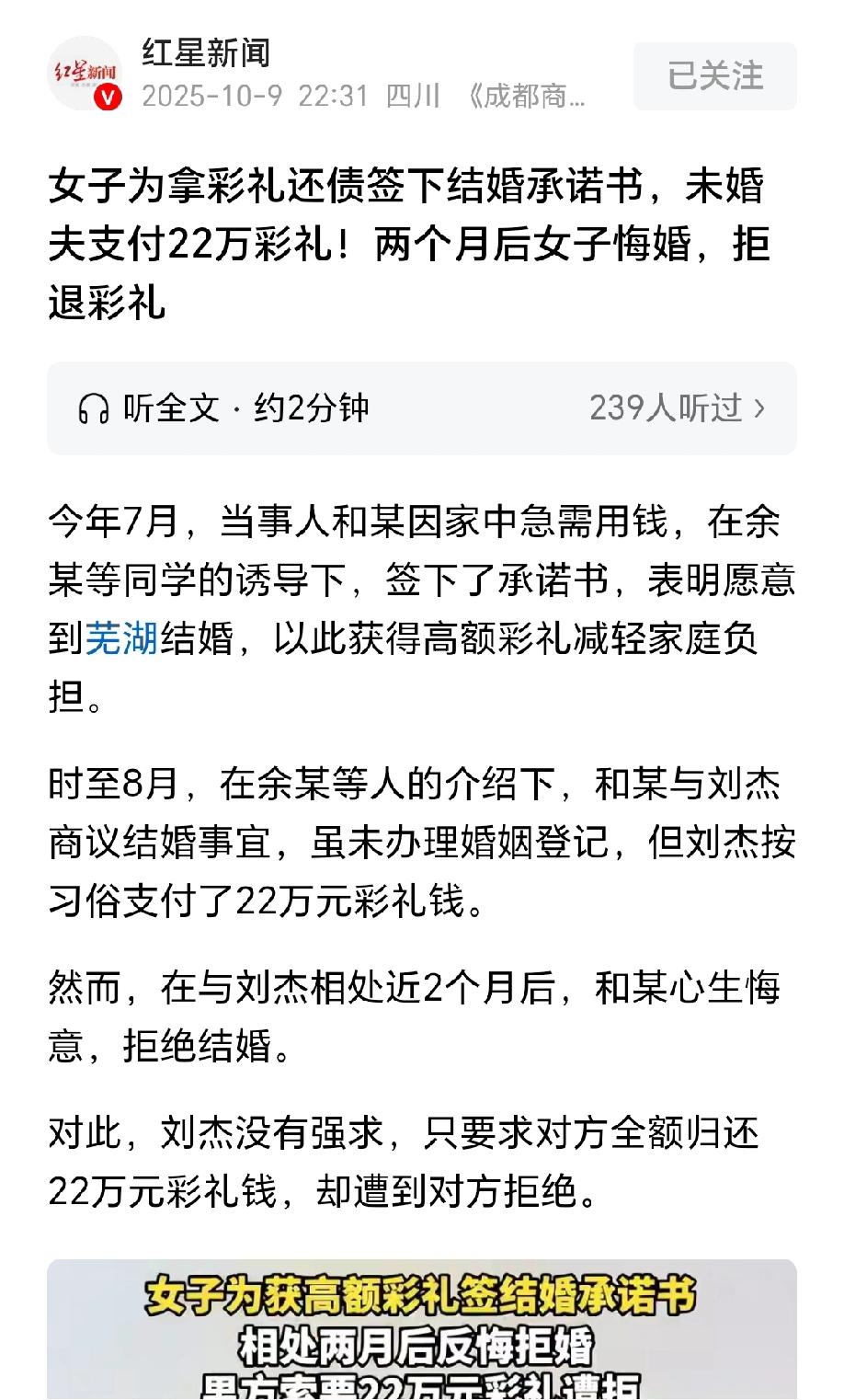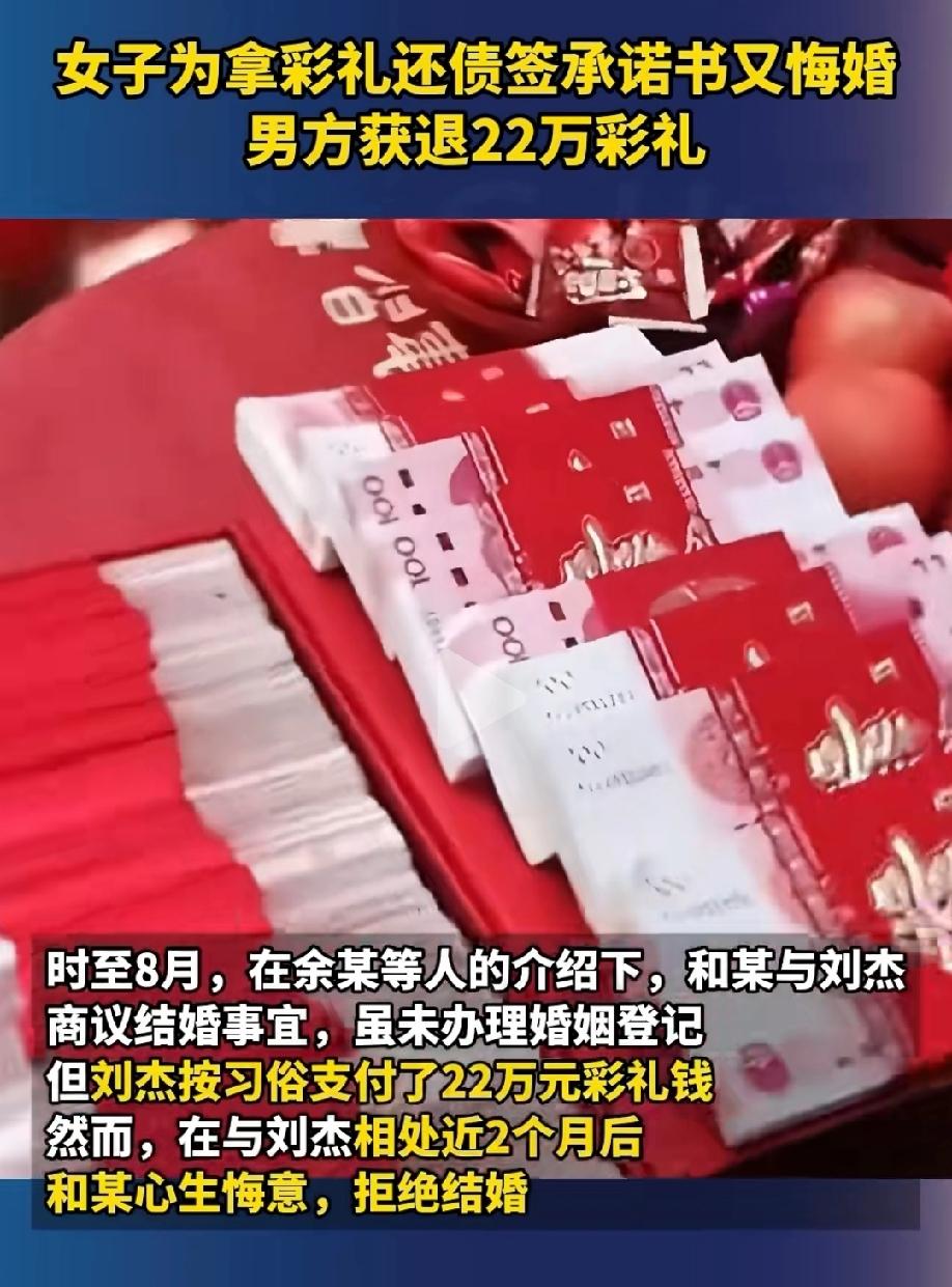 安徽芜湖,女子家中负债累累,为解燃眉之急,她在同学的诱导下,和一男子签订结婚承诺书,一次性拿到了22万的彩礼。相处两个月后,女子觉得这不是她想要的爱情,于是提出悔婚。男子没有强求,同意退婚但要女子退还22万彩礼,不料却遭到女子拒绝。女子:彩礼用来给老家还债了,只有13万 爱要不要。男子报警后,民警的处理让人竖起了大拇指。 2025年7月,和女士正为家里的债务愁得睡不着觉,手机里催款信息一条接一条,老家父母的电话更是让她坐立难安。 就在这时,同学余某突然找上门,说有个快速凑钱的办法,能帮她一次性解决债务难题。 余某告诉她,芜湖这边的彩礼很高,和女士只要愿意在这边找个结婚对象,拿到一大笔彩礼,这些债务也就不用担心了。 余某的话像根救命稻草,和女士明知这事儿不靠谱,可一想到老家等着还债的父母,还是咬着牙答应了。 和女士也有担忧,但余某劝说她,找个人先签个结婚承诺书,拿到彩礼,等家里缓过来了,要是觉得不合适,再商量退婚的事。 和女士没多想,满脑子都是先拿到钱再说,感情不合适了还可以退婚,法治社会谁也不能强迫她嫁人。 随后,余某就把刘某介绍给了和女士。两人见面没聊几句结婚的细节,重点谈了彩礼。 刘某对和女士很满意,愿意按当地习俗,一次性给她22万的彩礼,前提是要签订结婚承诺书,准备后续领证结婚。 和女士当时光顾着高兴,一口答应下来,没办婚姻登记,就先收下了这22万,转头全打给老家还了债。 可相处还没到两个月,和女士就后悔了。她发现自己跟刘某根本合不来,没共同话题不说,一想到当初是为了钱才谈婚论嫁,心里就越来越别扭。 这不是她想要的日子,更不是什么爱情,和女士思前想后,还是跟刘某提出了悔婚。 刘某倒也没强人所难,没指责和女士,就一个要求:退婚可以,和女士得把22万彩礼全还他,这钱是他准备结婚用的,不是白给的。 没想到这话一出口,和女士立马变了脸,这22万彩礼早给老家还债了,她现在手里就剩13万,爱要不要。 这话彻底惹恼了刘某,双方吵得不可开交,最后只能报警求助。 民警赶到现场,听两人把来龙去脉说清楚,心里也有了数。 民警先劝和女士:你拿彩礼还债是急用钱,但当初收这钱是奔着结婚去的,现在悔婚,按规矩就该把彩礼退回去,不能让人家吃亏。 随后,民警又劝说刘某,希望能把大事化小,给和女士一个缓冲,别把矛盾闹大。 《民法典》第1049条规定:要求结婚的男女双方应当亲自到婚姻登记机关申请结婚登记。符合本法规定的,予以登记,发给结婚证。完成结婚登记,即确立婚姻关系。未办理结婚登记的,应当补办登记。 和女士与刘某签订的结婚承诺书仅为双方就结婚事宜达成的初步合意,属于婚约范畴,并未经过婚姻登记机关的审查与登记,不具备确立婚姻关系的法律效力。 《最高人民法院关于适用〈民法典〉婚姻家庭编的解释(一)》第5条规定:当事人请求返还按照习俗给付的彩礼的,如果查明属于以下情形,人民法院应当予以支持:(一)双方未办理结婚登记手续。 和女士与刘某仅签订结婚承诺书,未依法办理婚姻登记,双方并未建立法律认可的婚姻关系,彩礼给付的核心条件未达成。 刘某支付22万元的明确前提是准备后续领证结婚,该款项符合当地习俗中以结婚为目的的彩礼特征,而非普通赠与。 即便彩礼已实际处分,和女士也不能免除返还义务。 《最高人民法院关于审理涉彩礼纠纷案件适用法律若干问题的规定》第2条规定:禁止借婚姻索取财物。一方以彩礼为名借婚姻索取财物,另一方要求返还的,人民法院应予支持。 和女士因家庭负债,在同学诱导下明确以获取高额彩礼偿还债务为目的接触刘某,可见和女士接收22万元的核心动机是解决债务,而非基于真实婚姻意愿。 这种以婚姻为对价索取财物的行为,完全符合借婚姻索取财物。 即便双方有短期相处,也无法改变财物索取的本质,因此刘某要求全额返还具有充分法律依据。 婚姻无法达成,和女士继续占有这22万彩礼,本质上属于不当得利,理应返还给刘某。 最终,经过民警的耐心协调,在民警的见证下,和女士最终凑齐了22万,一次性还给了刘某,双方也签了协议,互不追究责任。 拿到钱的刘某特地给民警送了面锦旗,感谢民警的暖心调解,没让他落个人财两空的下场。