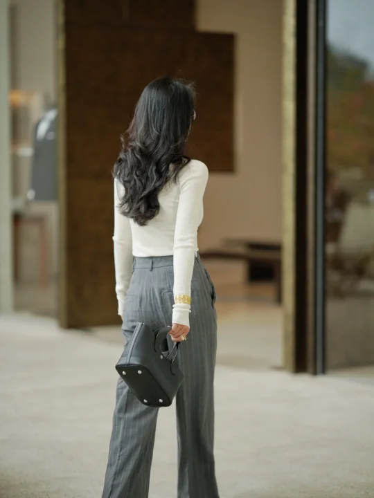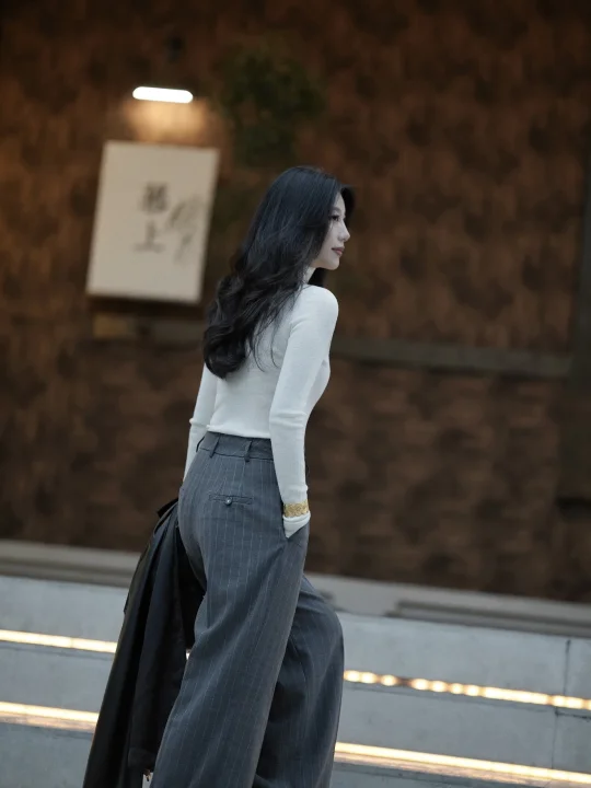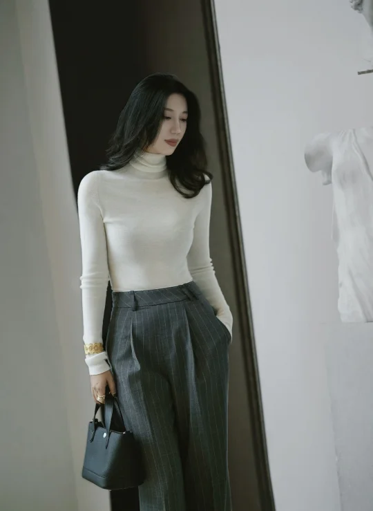当柔软的白色针织,遇上硬朗的条纹西裤,
