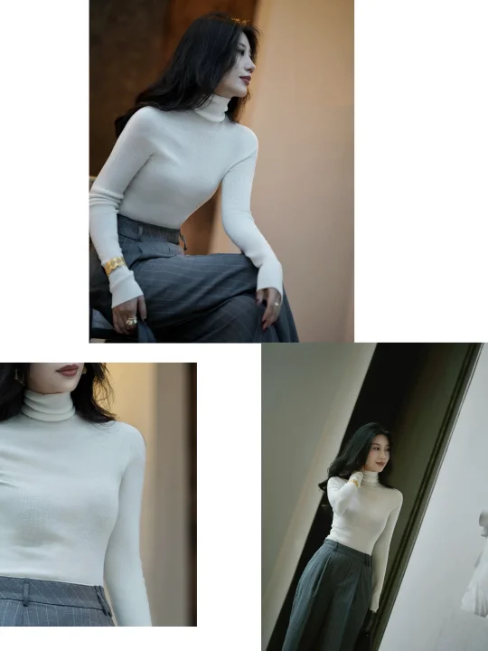 作为内搭界的万能单品,这件白色高领针织衫,