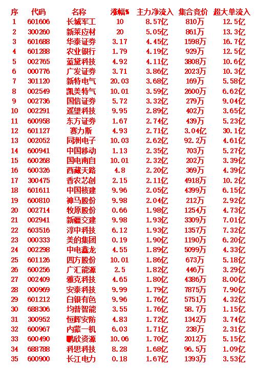 10月10日收盘,主力趁冲高,已经大幅卖出的35名单: 立讯精密:主力净流出30.5亿元 宁德时代:主力净流出30.2亿元 阳光电源:主力净流出27.6亿元 东方财富:主力净流出26.5亿元 中芯国际:主力净流出24.9亿元 胜宏科技:主力净流出24.2亿元 北方稀土:主力净流出23.4亿元 三花智控:主力净流出21.7亿元 山子高科:主力净流出17.9亿元 先导智能:主力净流出17.8亿元 10月10日收盘,主力资金“大幅买入”的35强: 长城军工:主力净流入8.57亿 新莱应材:主力净流入5.05亿 华泰证券:主力净流入4.45亿 农业银行:主力净流入4.19亿 蓝黛科技:主力净流入4.11亿 广发证券:主力净流入3.86亿 新特电气:主力净流入3.68亿 凯美特气:主力净流入3.59亿 国信证券:主力净流入3.32亿 遥望科技:主力净流入2.89亿 东方证券:主力净流入2.74亿 赛力斯:主力净流入2.71亿