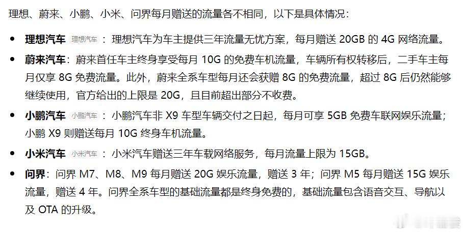 查了一下各家,问界和理想都是20GB,蔚来实际也是20GB,就是小鹏少点。但我以前用小鹏,也没买过流量包。