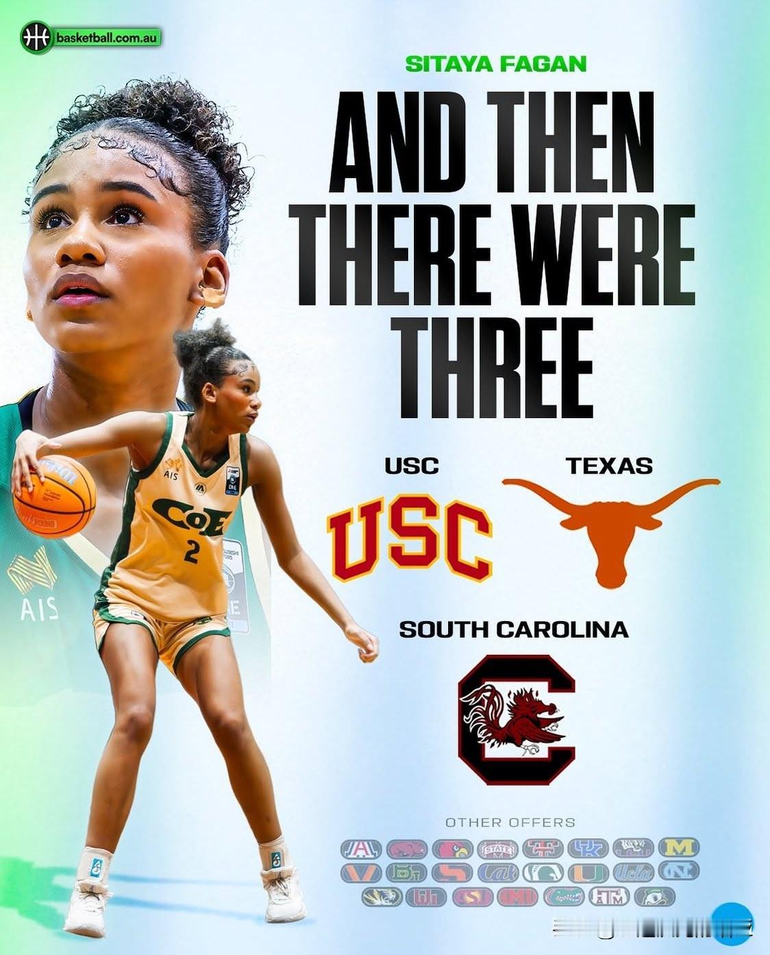 澳大利亚五星侧翼Sitaya Fagan宣布承诺NCAA女篮 南加大USC,拒绝了上赛季四强球队德州与南卡大学,身高6-2=188,出生于2008年3月,球队这届收到的第二位加盟者,之前还有全美第一人Saniyah Hall,今夏U19女篮世界杯场均24分钟得到12.3分5.8篮板1.3助攻1.3抢断1盖帽。