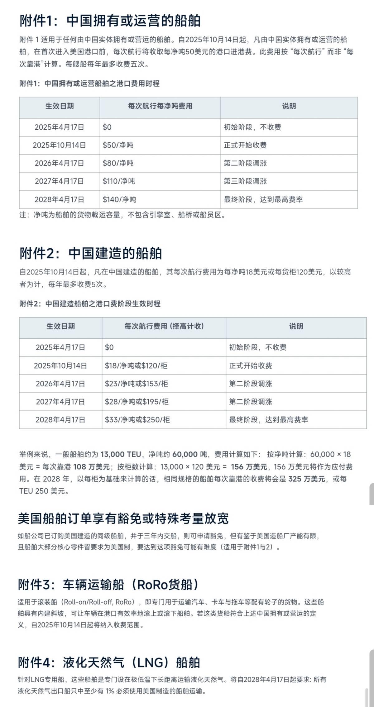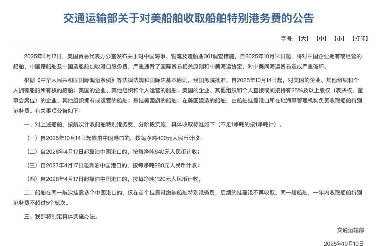 美国“港口费”将生效,中方强硬反制:对美国船舶收取特别港务费 10月10日,中国交通运输部发布公告,将从10月14日起,对美国船舶征收“特别港务费”。具体适用对象有5类,大致分为: 1. 美方拥有的船舶 2. 美方运营的船舶 3. 有美方股份超过25%的实体所拥有/运营的船舶 4. 悬挂美国国旗的船舶 5. 美国建造的船舶。 至于收费标准,则是按阶梯计价,具体请看图1。 事实上,今年4月,美方曾宣布要对中国船舶加收港口服务费,具体政策在10月14日生效。如今,中方选择在美方政策生效同日开始收取费用,显然是中方对美国的单边霸凌行为的又一次精准且强硬的反制。 首先,中方收取费用的对象只涉及美方船只,并不牵扯其他国家。很明显,中方是在反制美国,美方却是在用荒唐的手段展开单边霸凌,希望通过损害别国利益来提振自身造船业发展。中方对美船舶收取船舶特别港务费 其次,中方与美方一样,使用了阶梯收费标准,并且收取的费用也与美方几乎相当。这正是在向美方表明中方反制措施的持久性和坚定性,同时也是在告诉美国人,如果他们及时改正错误,那中方也愿意与美方合作共赢。 值得注意的是,中方政策留有余地——设置年度收费上限、豁免重复收费等条款,都表明这并非要彻底切断中美海运联系,而是希望通过成本压力促使美方回到谈判桌前。这种“斗而不破”的策略,展现了大国外交的成熟智慧。 展望未来,中美在海运领域的博弈可能向三个方向发展:一是双方通过谈判达成新的平衡,二是博弈向更多领域扩散,三是形成长期对峙的新常态。从目前态势看,短期内达成全面妥协的可能性不大,更可能进入一个边打边谈的相持阶段。