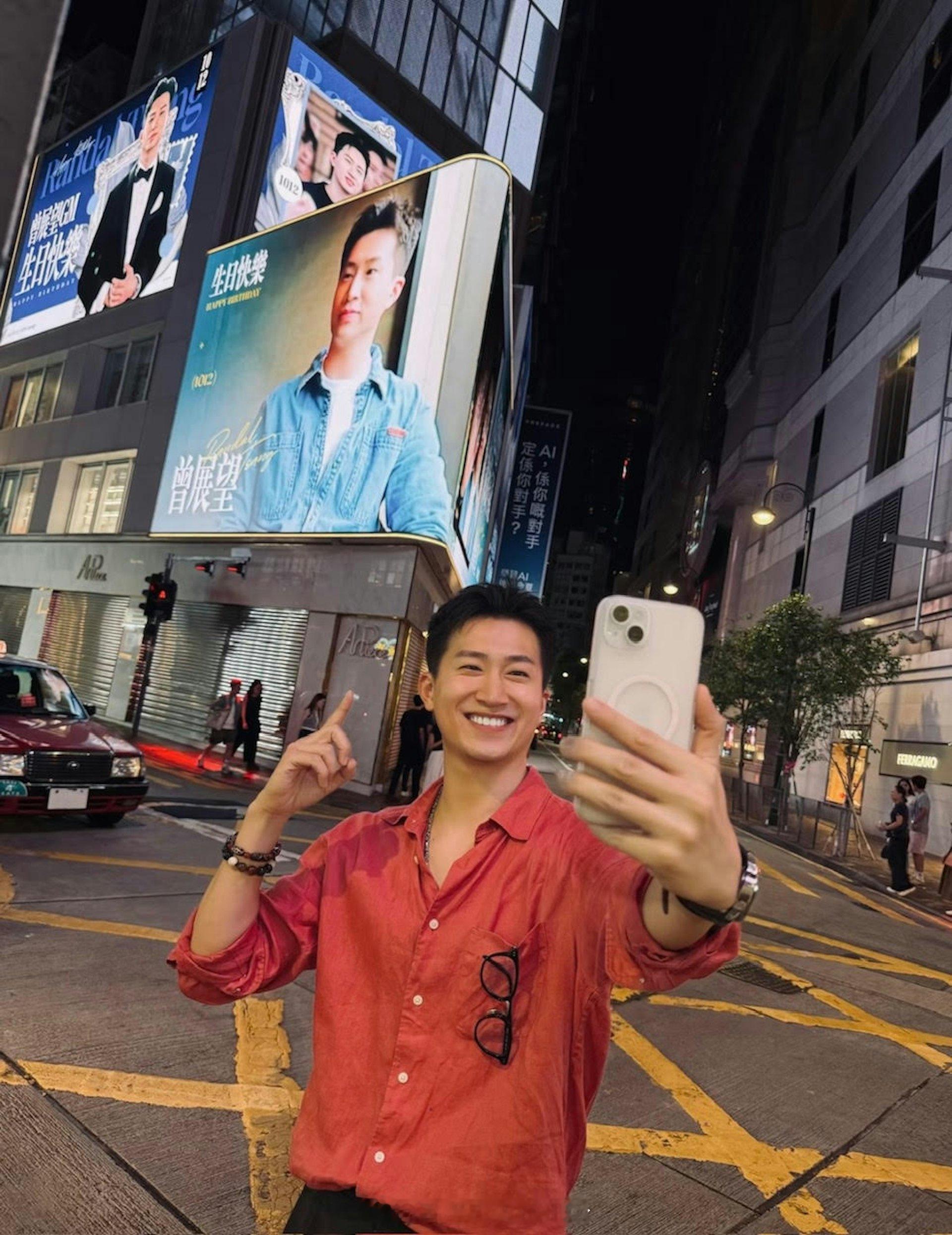 眼见粉丝们如此用心,曾展望亦有亲赴该地打卡留念,眼见他身穿鲜色衬衫上阵,展现灿烂笑容,在马路旁的安全位置上举起手指,指向生日广告屏幕,并手持手机玩自拍,留言表示:“谢谢你们的礼物,谢谢你们的用心,谢谢你们比我自己更着紧我的生日,有点被求婚的感觉。”