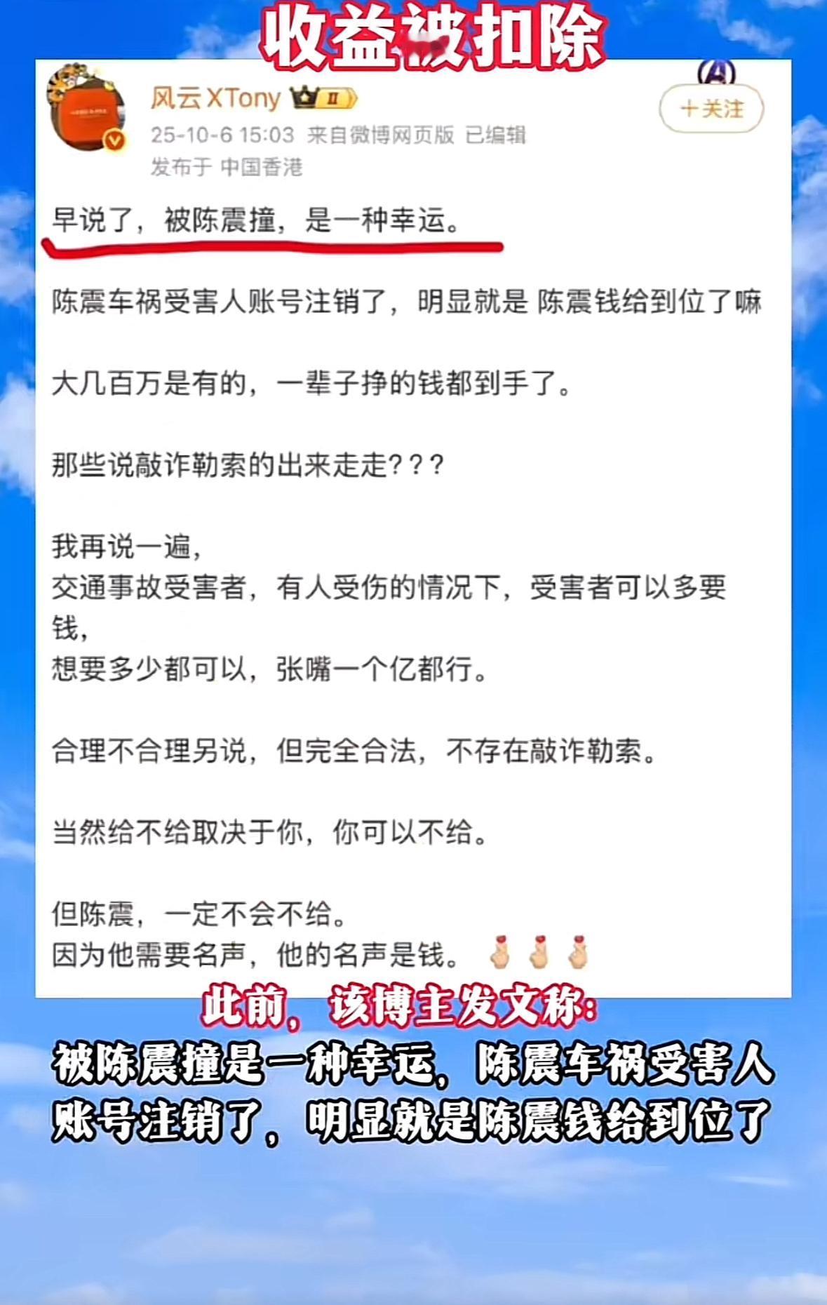 陈震出的车祸,相信大家都从各种渠道得知了,被撞的家属也道出了家庭困难。具体的处理内情咱们目前无从得知,但是相信有个合理的赔偿范围。 被禁言的博主被扣除,近期全部的收益!官方给的理由是,营销炒作交通事故,宣传不良价值导向。很多人不管什么流量都蹭,这下好了,但是网络不是法外之地,有了流量不代表你就可以没有道德,200万粉丝基本的常识都没有吗?