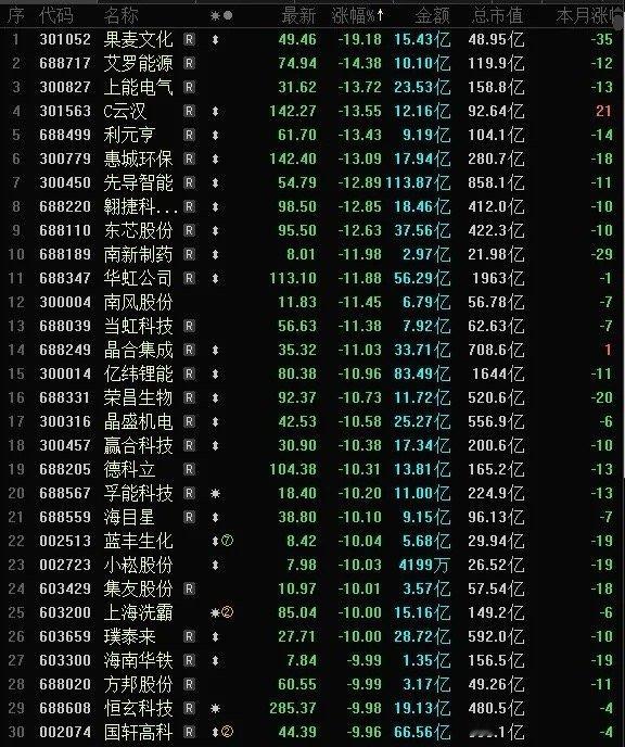 上能电气(储能)大跌13CM,利元亨(固态电池)大跌13CM,先导智能(电池)大跌12CM,东芯股份(半导体)大跌12CM,华虹公司(半导体)大跌11CM,亿纬锂能(电池)大跌10CM,荣昌生物(创新药)大跌10CM;蓝丰生化昨天天地板,今天继续跌停板,节前高标空间板。