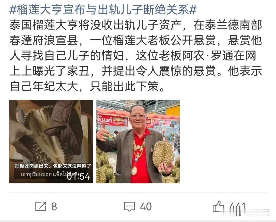 泰国榴莲大亨将没收出轨儿子资产,现在有钱人能做到这个程度真不容易,榴莲大亨三观很