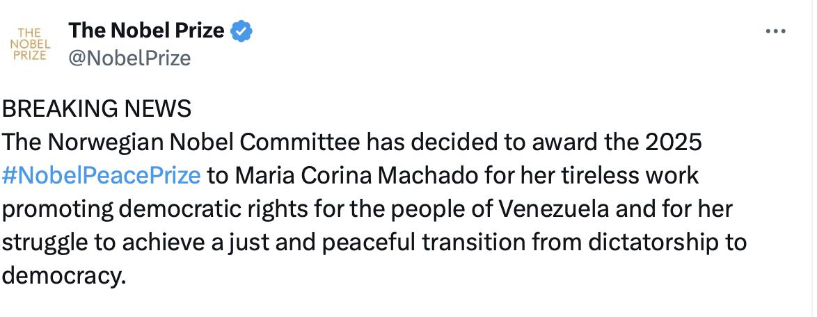 【诺贝尔奖和平奖发布,特朗普无缘】 诺贝尔奖委员会在X平台上发布消息称:10月10日,挪威诺贝尔委员会决定将2025年诺贝尔和平奖授予委内瑞拉反对派人士玛丽亚·科里娜·马查多,以表彰她为委内瑞拉人争取权利所做的不懈努力和斗争,毫无疑问,这次特朗普获奖的愿望落空了,不过这也不奇怪,因为在和平奖揭晓前,外界已经普遍评估到:特朗普没有机会获奖,至少今年没有机会,挪威政坛甚至已经提前发布预警,要求政府为特朗普“未拿到和平奖”可能出现的过激行为和疯狂举动做准备,因为后者很喜欢“公器私用”,拿着国家权力进行报复。诺贝尔和平奖 事实上,特朗普这次是否入围都成了一个大疑问,尽管有不少国家提名特朗普拿奖,但今年的和平奖提名其实已在1月截止,特朗普压根就没有机会入围,不过今年没有机会,明年或许有机会,明年的诺贝尔和平奖评审将着重以今年的局势做评估,而且到了明年评审时,特朗普这一名字肯定已经入围,至于说能否选上,这可就成了一个未知数。专家:特朗普无缘诺贝尔和平奖 不过挪威专家评估,特朗普虽然一再自夸自己调停了很多场冲突,但他退出气候协定、扰乱世界贸易秩序,甚至对格陵兰岛发出赤裸裸的“吞并”威胁,很难想象独立的诺贝尔和平奖评审委员会会把奖项颁给他!