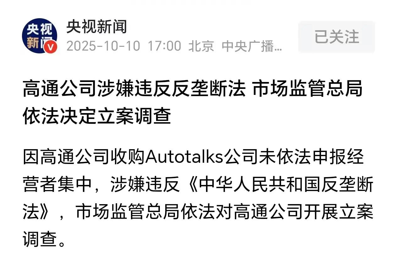 高通终于被反垄断调查了,那些一到新机发布会就狂吹高通新芯片的伪中国企业开始抓瞎了吧? 一个不过是借助了美国政府的庇护才能勉强在市场存活的软脚蟹而已,结果被一些买办狂吹,发布会那骄傲的表情搞得我们还以为是他们自己的产品这样有竞争力。 这和蛙岛上那群沙茶一模一样,动不动就是美国有这样有那样可以打败中国,我就想问一句,那是你的吗?和你有啥关系?你买它一个产品就变高级你就骄傲了? 啥德行! 这次是高通,迟早会轮到苹果。我们工具箱里的东西还多得很,随便税宗怎么去折腾。 点右上角关注我,我们一起去看这个魔幻的世界