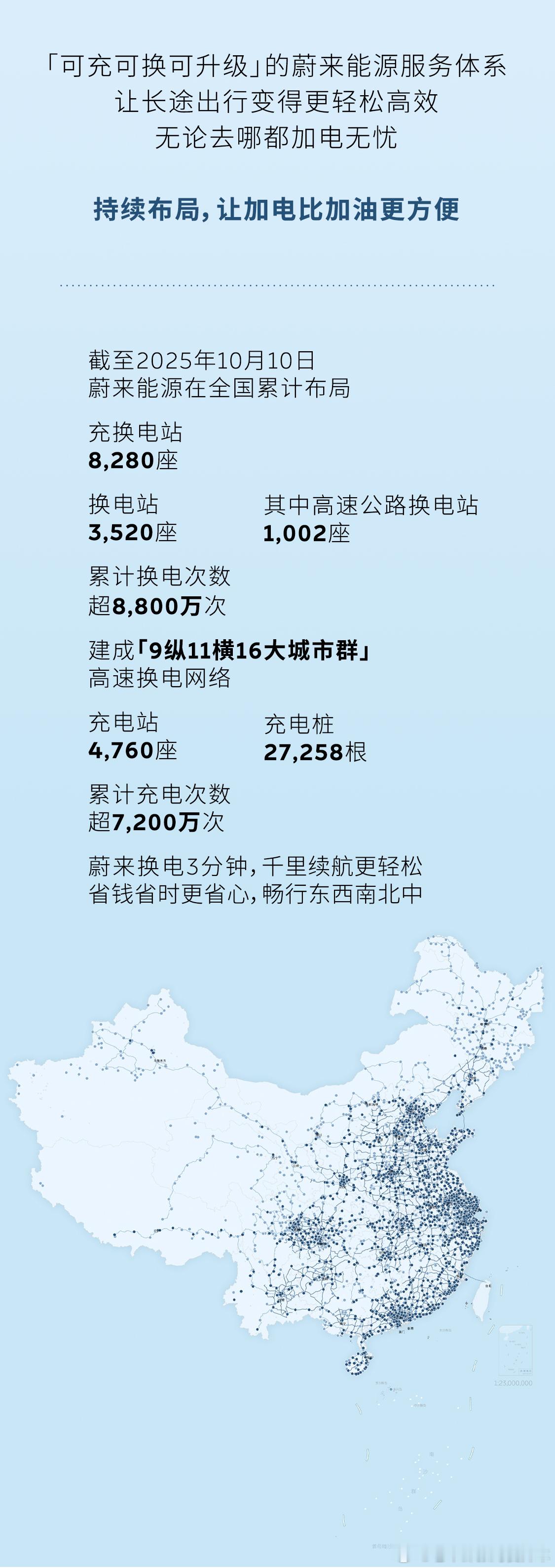 蔚来于2025完成G318川藏换电路线的全线贯通,从成都到西藏定日县,全程超2950公里,共布局15座换电站,用户可通过全国3520座换电站,全程换电到珠峰。自8月16日G318川藏换电路线贯通至10月8日短短50多天,自驾进藏的蔚来公司用户较去年同期增长252%。