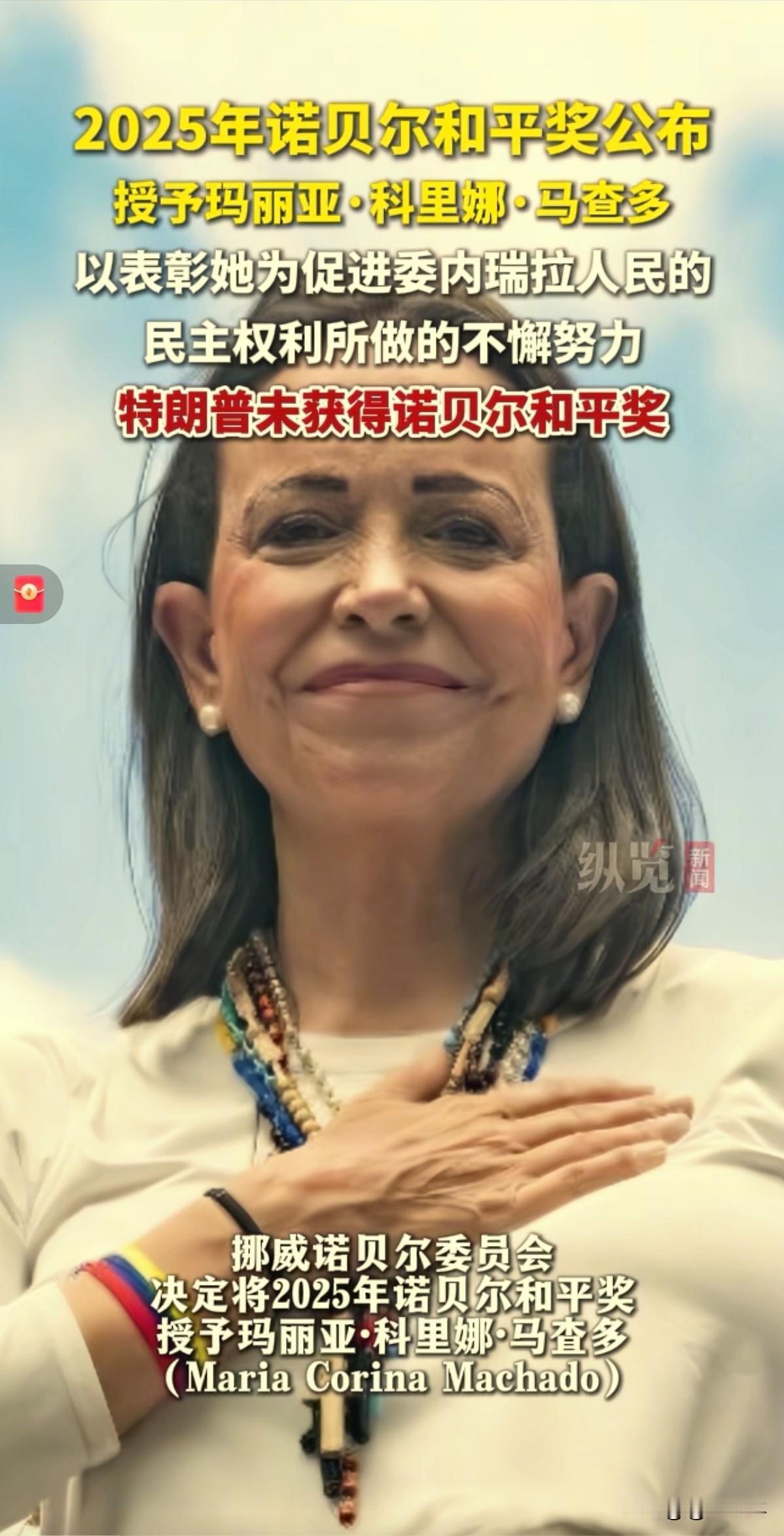 玛丽亚·科里娜·马查多(Maria Corina Machado)摘获2025年诺贝尔和平奖,委内瑞拉民主斗士马查多,表彰她为促进委内瑞拉人民的民主权利所做的不懈努力。 特朗普一直执着于这个奖项,为此发起了一场声势浩大的造势活动,结果成了雷声大雨点小,这下川普该郁闷了! 你认为特朗普该不该得到诺贝尔和平奖?
