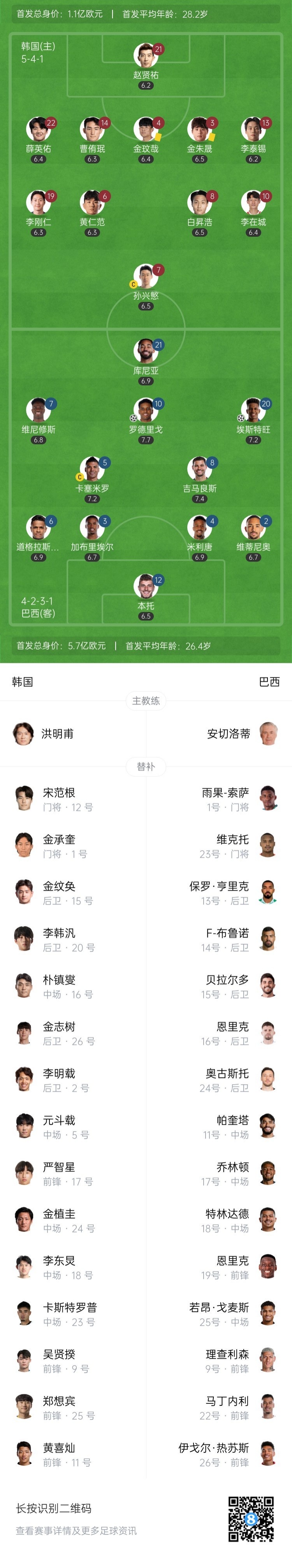 第41分钟,维尼修斯左路回敲,罗德里戈故意一漏,卡塞米罗不停球再做给罗德里戈,罗德里戈禁区内调整到右脚兜射破门!巴西2-0领先韩国↓