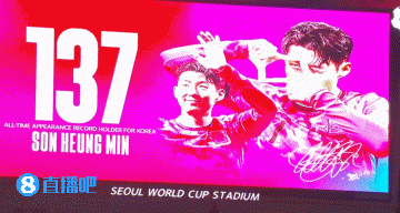 第9分钟,现场大屏幕显示,孙兴慜以137次出场打破韩国国家队出场纪录↓