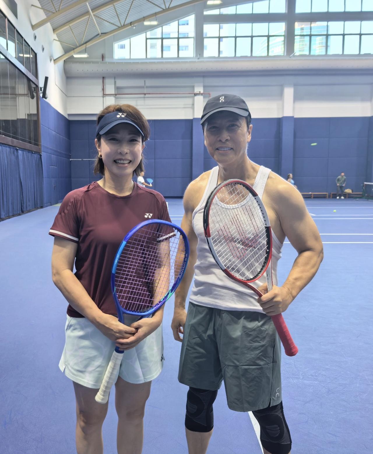 10月9日,网球运动员郑洁晒与甄子丹合影,两人在上海网球大师赛上的开心瞬间。 甄子丹戴着棒球帽,身穿白色背心和短裤,型男的身材,硬汉的气质,62岁的他,依然元气很足的样子。甄子丹 郑洁