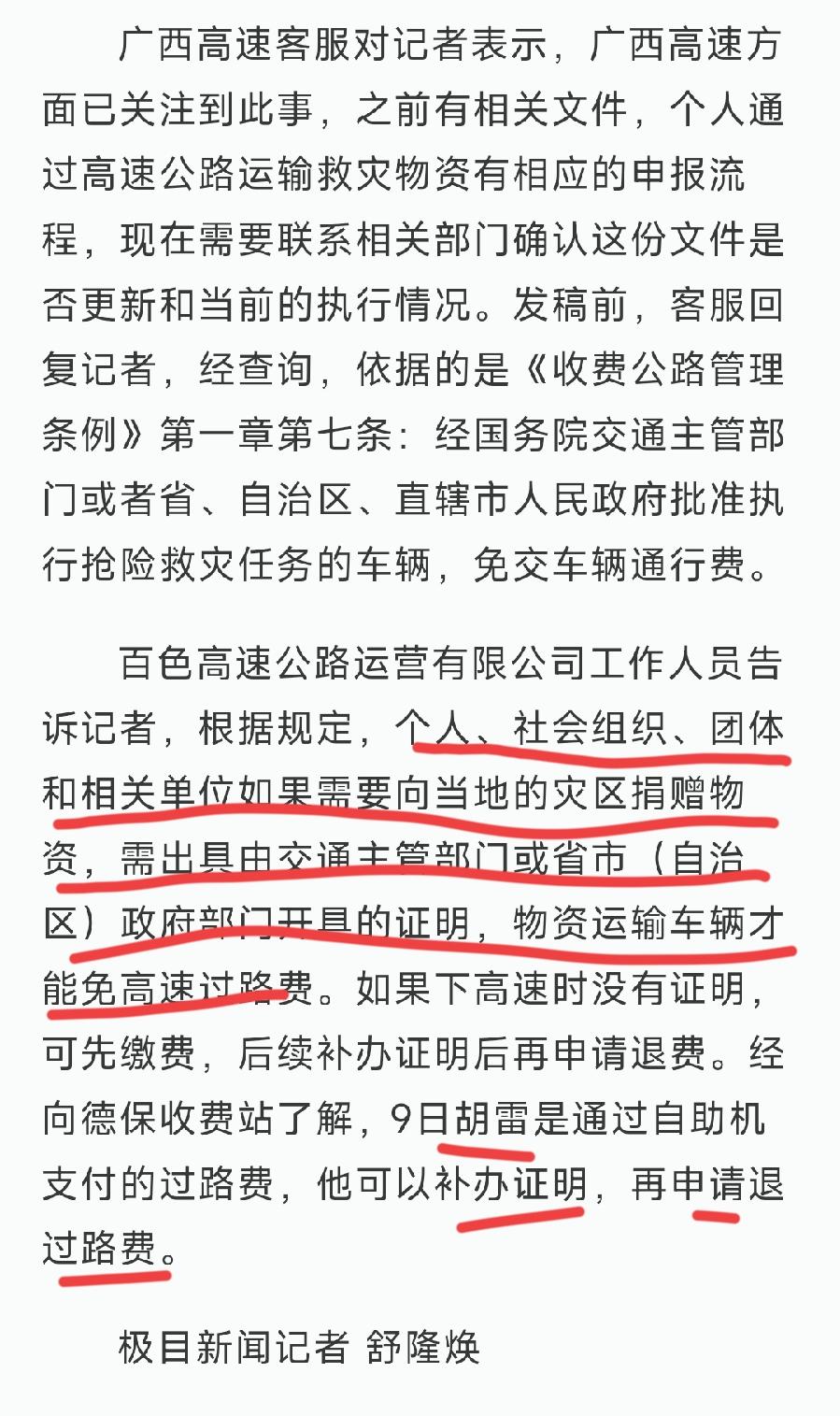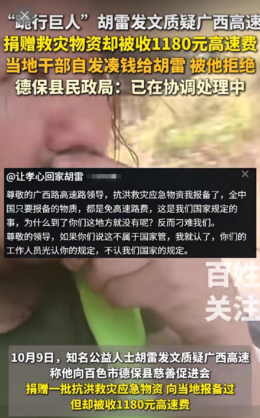 有没有人懂怎么回事呀?爱心人士胡雷捐赠的物资,广西收费站怎么能收费呀? 我记得0