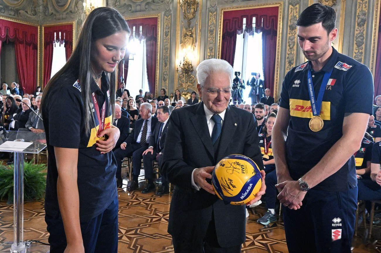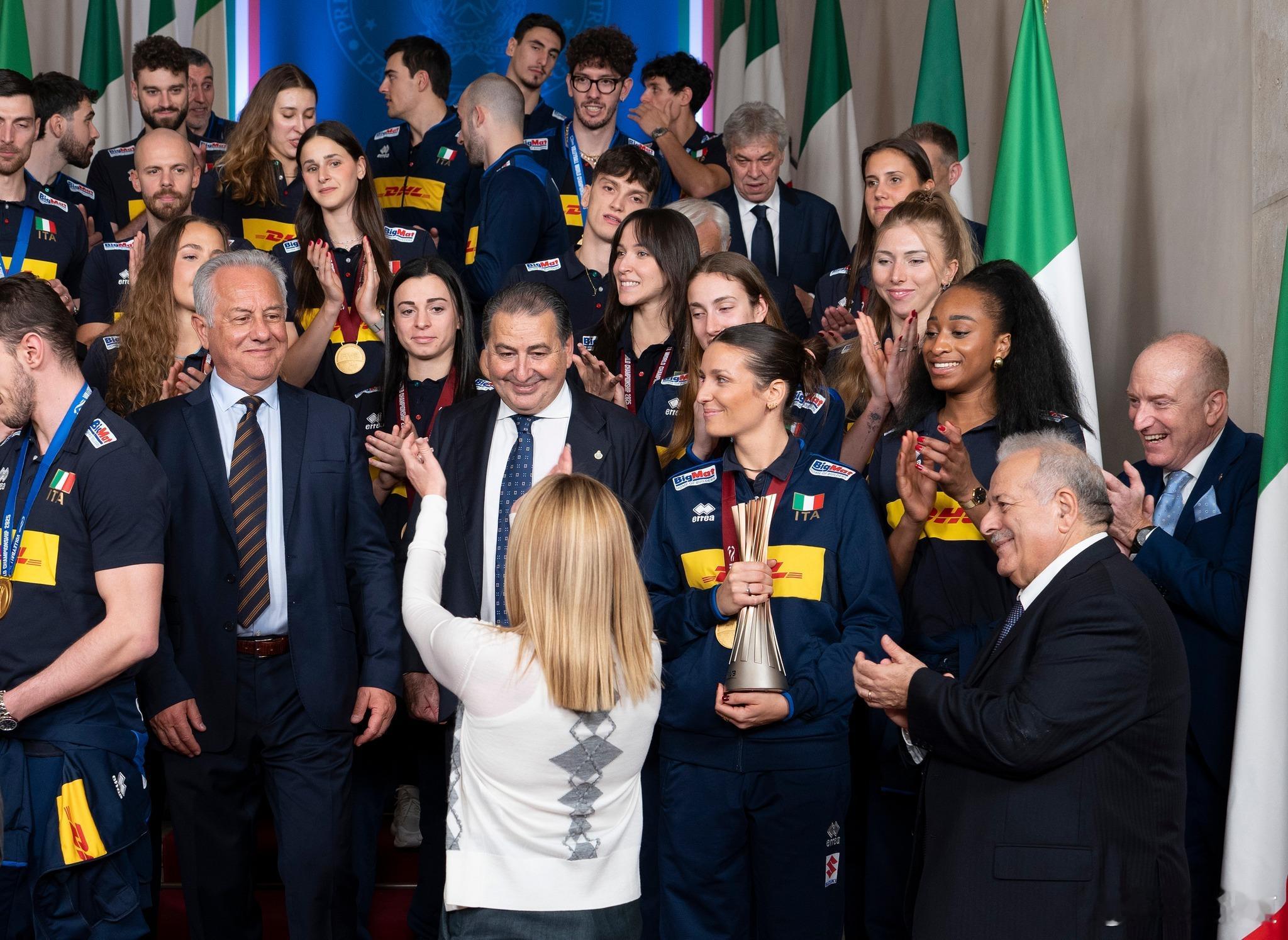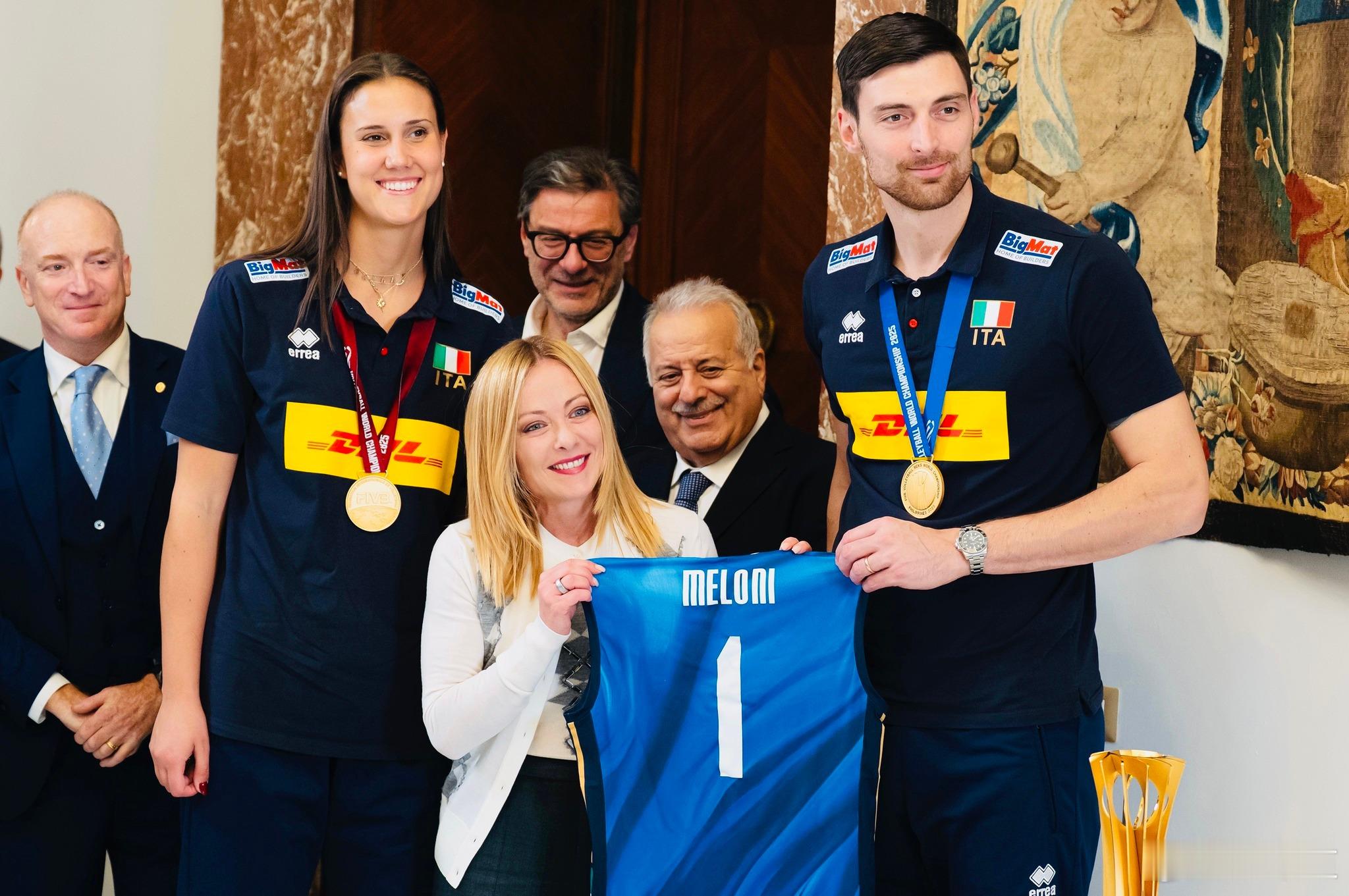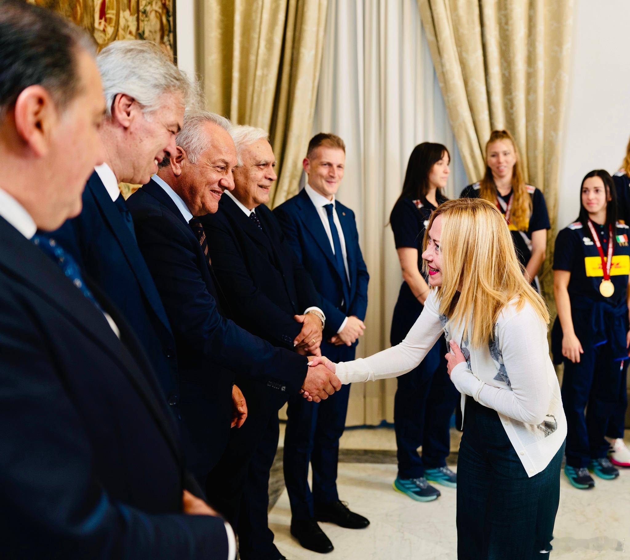 国际排坛动态意大利女排意大利男、女排国家队在 2025 年世界排球锦标赛中双双夺冠后,于罗马受到热烈表彰。两支队伍先是在奎里纳莱宫(意大利总统府)受到总统塞尔焦・马塔雷拉的接见,随后又在基吉宫(意大利总理府)得到总理乔治娅・梅洛尼的迎接。