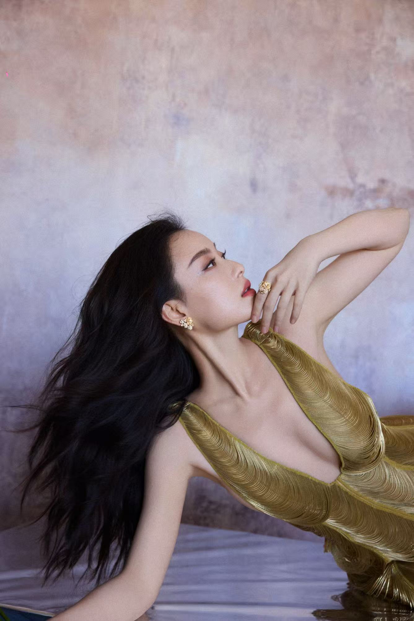 光影下的鎏金美人!身着深V礼服出席品牌活动,金属丝线编织出细腻肌理,既有雕塑般的