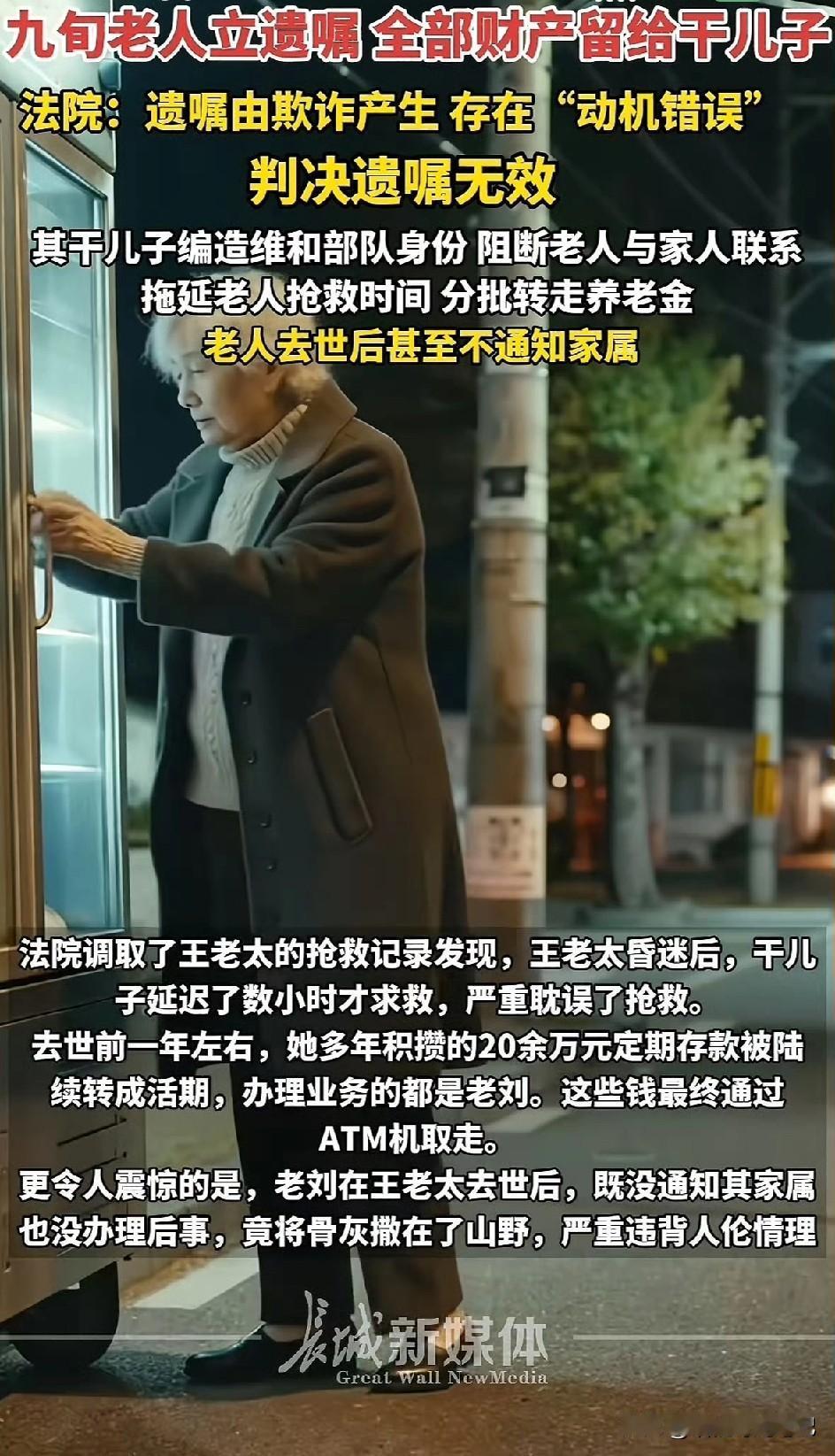 “干儿子”这三个字, 现在听起来像一句暗号, 上一秒:妈,您歇着我来! 下一秒:妈,您安息,我先走。 姐妹们,今天咱们聊一个“34万存款被‘维和干儿子’搬空”的事。 主角刘某:职业:自封‘国际维和部队军医’,一套假迷彩服+两斤猪油嘴,嘴上一套“阿姨我当年在南疆见过您”活像黄鼠狼给鸡拜年。王老太年轻时随军南下,记忆里有风沙也有勋章,结果被他当成“情感切入口”,三句“妈”一叫,直接升级成“干儿子”。 2019年,他把老太太从养老院“拐”去山东农村,换手机号、拉黑家属、天天耳边吹风:“你孙子不要你啦,你孙子嫌你累赘啦。” 接下来几年,他化身“提款机精”,34万多存款,蚂蚁搬家似的分批搬空,留的凭证?零!连根韭菜都没给子孙剩。碎更离谱的是,他哄老太太立遗嘱——纸是白的,字是黑的,心是乌的,想把人家整套房一口吞。 老太太病重昏迷,他拖延送医,等于在生死门口挂了一把“暂停营业”。人走了,骨灰他都能私埋。 最后,他反向操作,告家属! 脸皮比城墙拐角还厚, 拿着那份“代书遗嘱”上法庭: “法官大人,请把房子判给我,我是她最爱的崽!” 法官:??? 最终判决:遗嘱无效,房产按老太早年公证遗嘱归孙子, 34万存款全额吐出来, 刘某当场表演“社死+财空+刑责”三连击。 把“常回家看看”升级成“常视频看看”,让骗子没有“空窗期”可钻。银行流水月月查,取款限额日日锁,别让“提款机精”附体。遗嘱这事儿,别手写、别口传,公证处盖红章。 骗子的嘴,抹蜜的刀; 法院的铁锤,才是正义的狼牙棒! 亲情缺失处易生算计之心。唯有真诚陪伴与制度防线结合,才能守护晚年安宁。 [原创文章,图源网络]