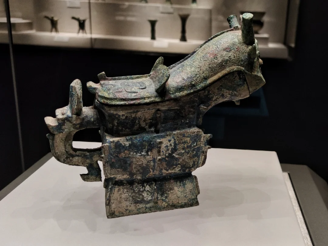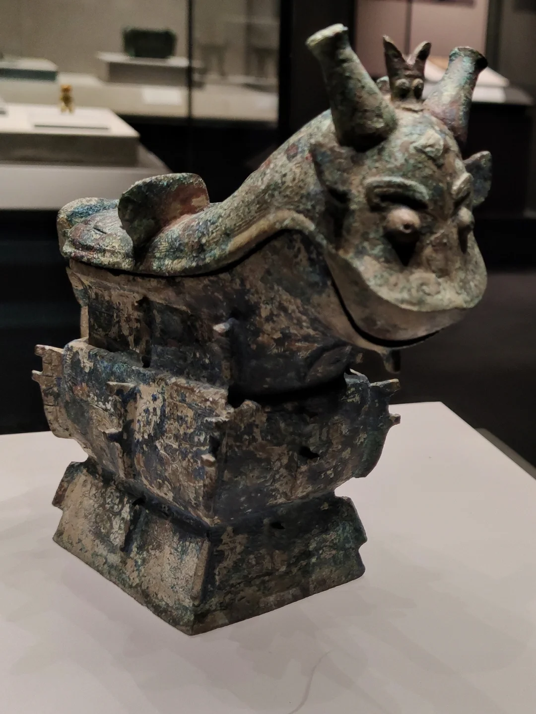 觥为中国古代的盛酒器,其特征为器腹椭圆,底有圈足或四足,前有短流后有颦( pan ),盖作有角兽首形,盛行于商末周初。《诗经》中屡见咒觥一词:"咒( si )觥其献( qiu ),旨酒思柔""跻彼公堂,称彼咒觥,万寿无疆"。