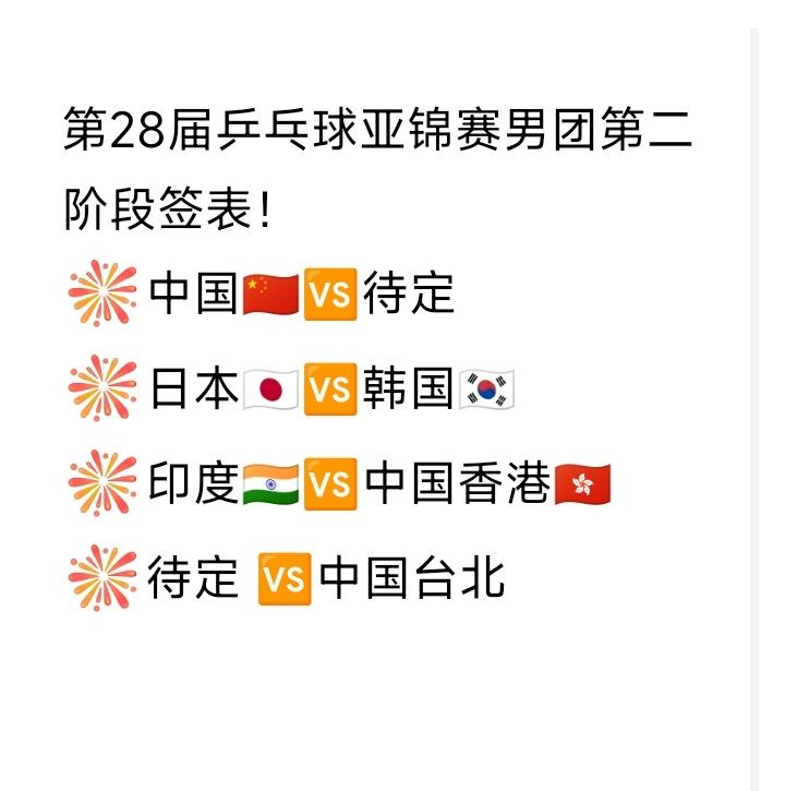 果然!日韩男团要打起来了![笑哭] 第28届乒乓球亚锦赛男团第二阶段签表如图所示。 亚锦赛第一阶段比赛是小组赛,中日韩、我们的两个省队和印度队都不需要进行第一阶段小组赛了,第一阶段小组赛中胜出的队伍进入第二阶段的比赛。 所以中国队男团的签位肯定是最好的了[笑哭]。 日本队男团就有点惨了,他们可是一直很惨啊,2023年平昌亚锦赛第一轮和中国队打,输了;2024年又和韩国队打,又输了;今年第一轮又跟韩国打,我希望他们再次重蹈覆辙[看]。