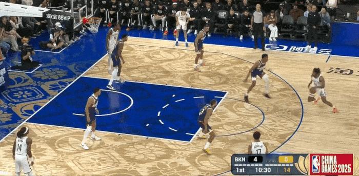 高难度抛投!小火车托马斯还是强! 在今天NBA季前赛篮网对阵太阳的第一节比赛中,