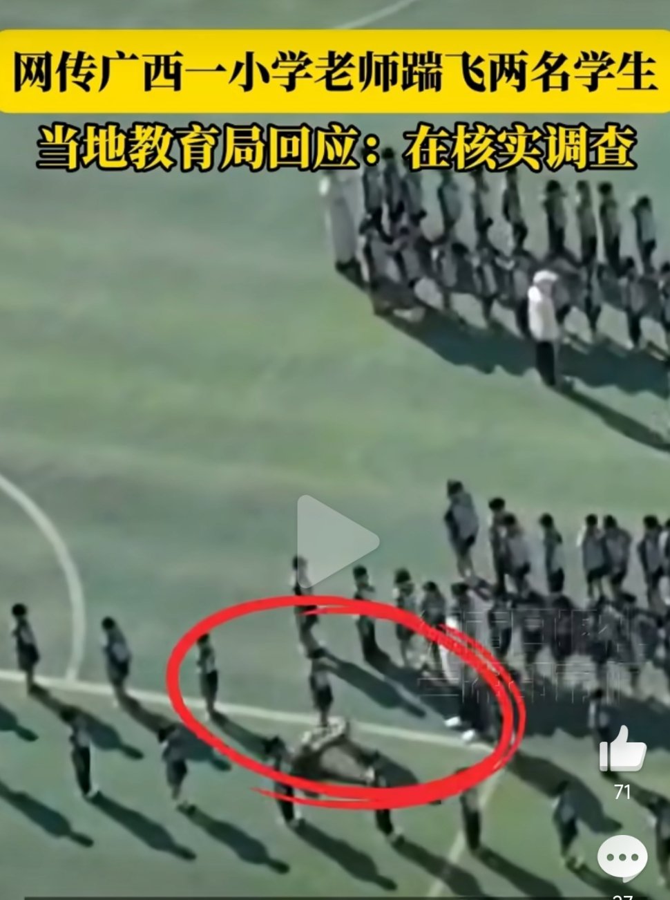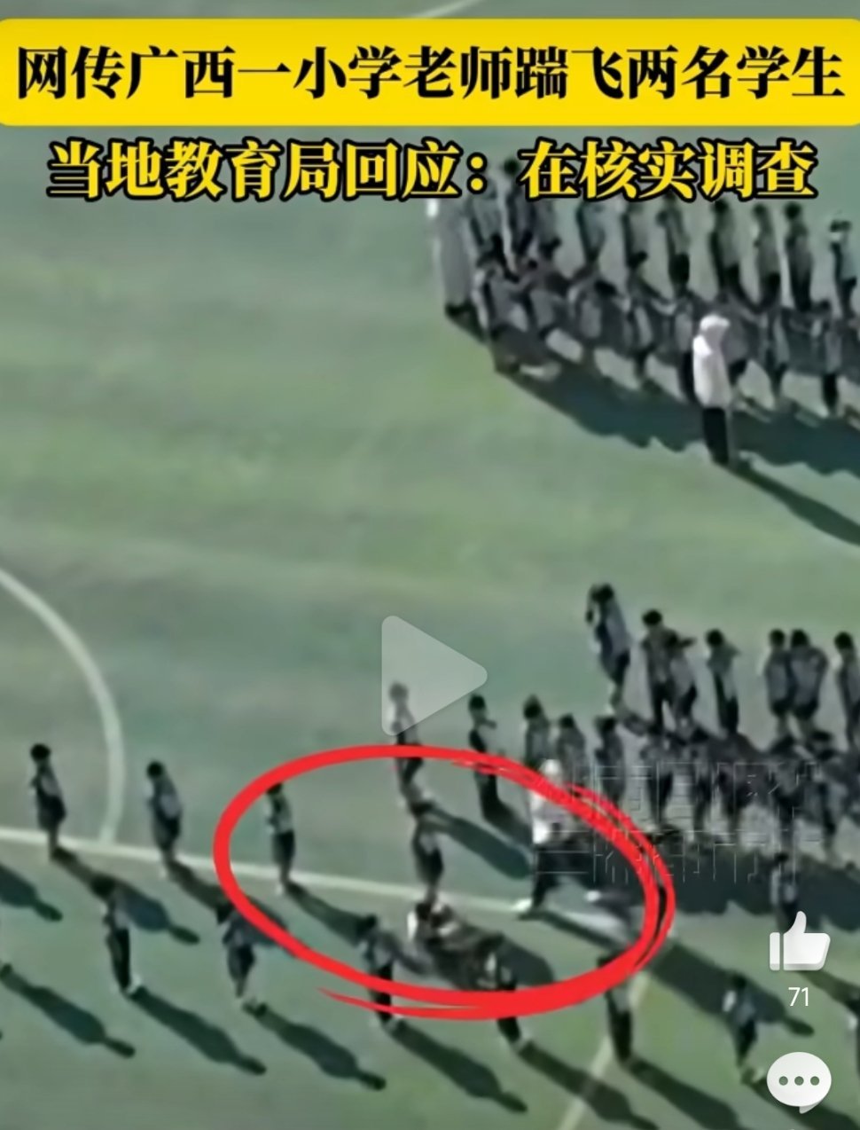 曝广西一小学老师踹飞两名学生网传广西一小学老师在操场踹飞学生的视频,看得人揪心 。无论学生是否违纪,脚踹这种暴力行为都已远超教育惩戒的边界。教师的天职是育人,而非施暴,这一脚踹伤的是学生身体,更寒了孩子的心。《中小学教育惩戒规则》早有红线划定,期待调查结果能明确追责,也给所有教