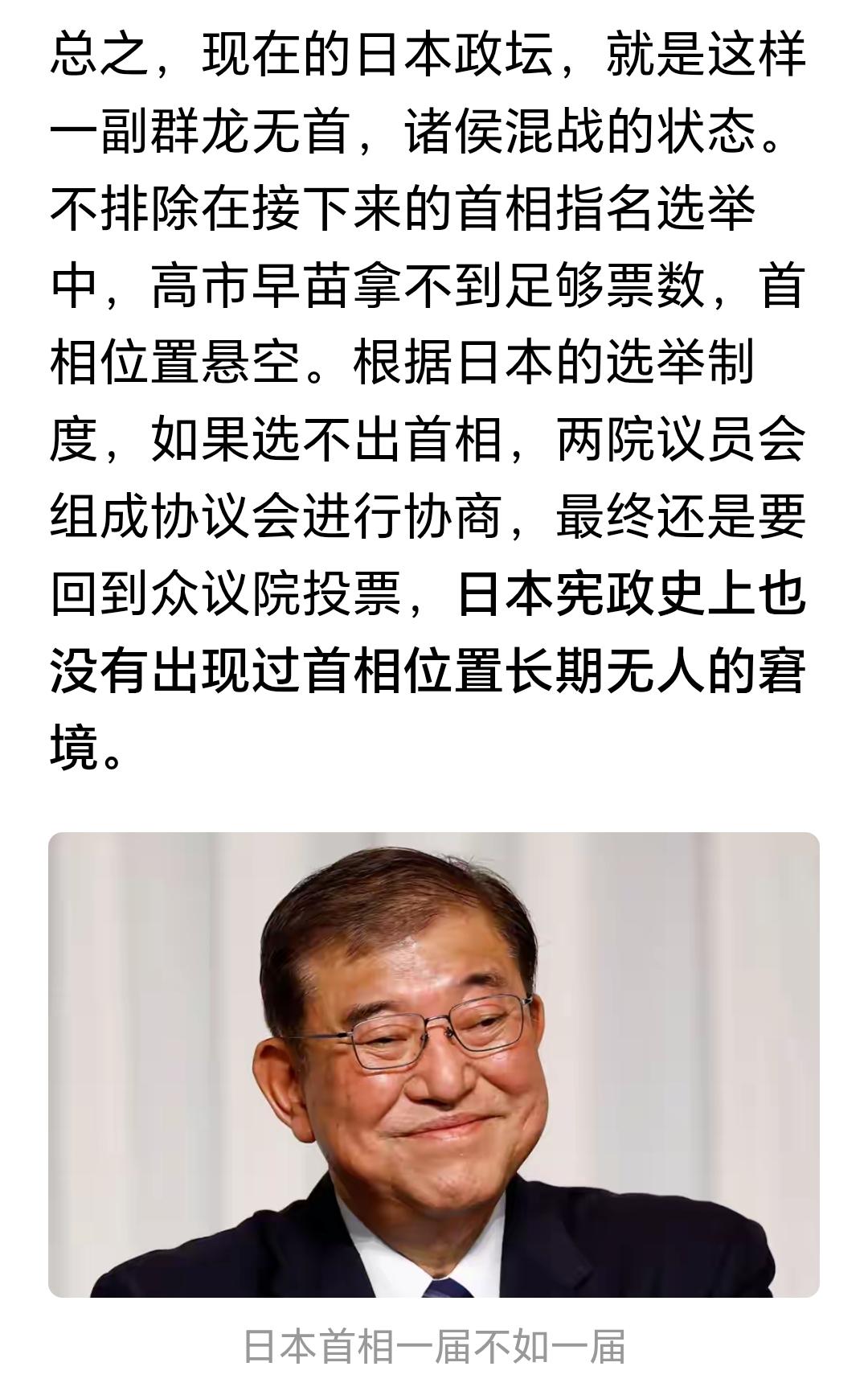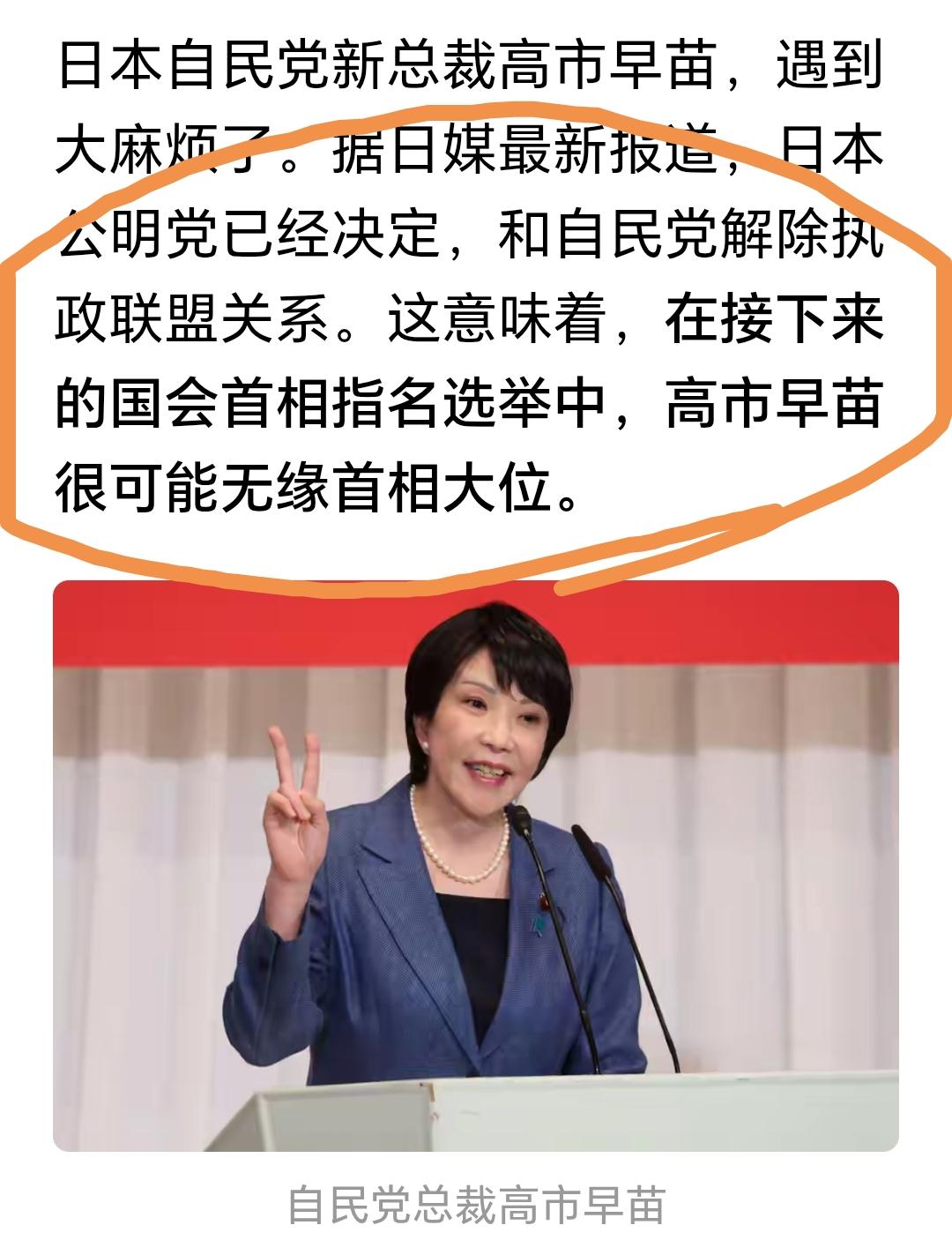 哈哈,高市早苗可能没有上台就会下台。麻生的能量再大也只是在自民党党内,影响不到公明党。没有公明党这个盟友,现在自民党在日本寸步难行。其他的在野党都是对手。 高市和麻生吃相太难看,尽管高市缓和了那些极端调门,但是黑金问题避不开。 公明党接受不了。 现在公明党决定和自民党分道扬镳,高市的首相指名显然就过不了。 日本的混乱还会继续,甚至可能很长一段时间都会没有首相。 现在在来回味石破茂的那邪魅一笑,就太有意思了。 顺便说一句,郑丽文现在后悔了吗?没有政治敏感度和基本底线,你只能做国民党主席,做不了中国国民党主席。 点右上角关注我,我们一起去看这个魔幻的世界