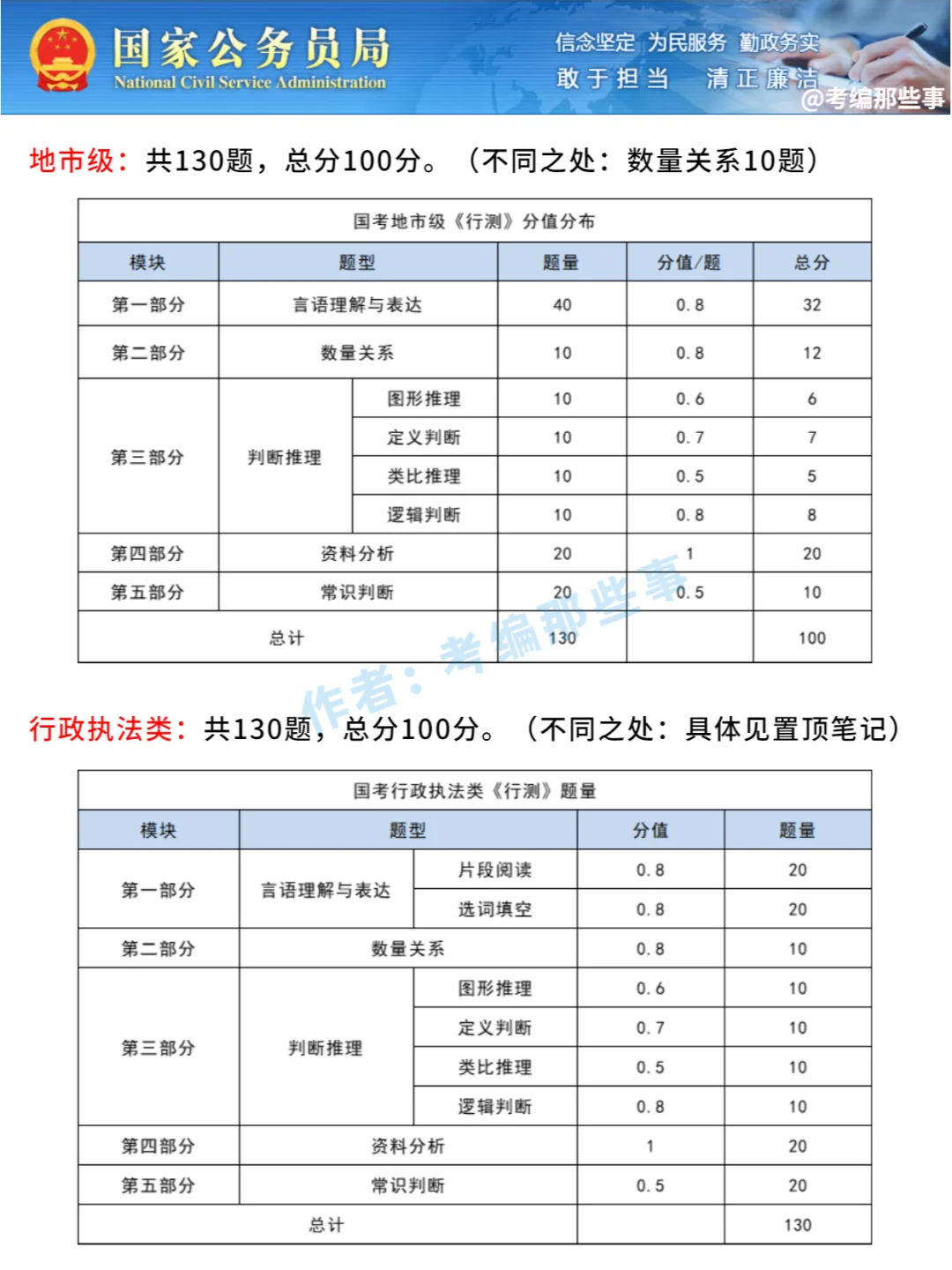 副省级共135道题,总分100分;地市级共130道题,总分100分;行政执法类共130道题,总分100分