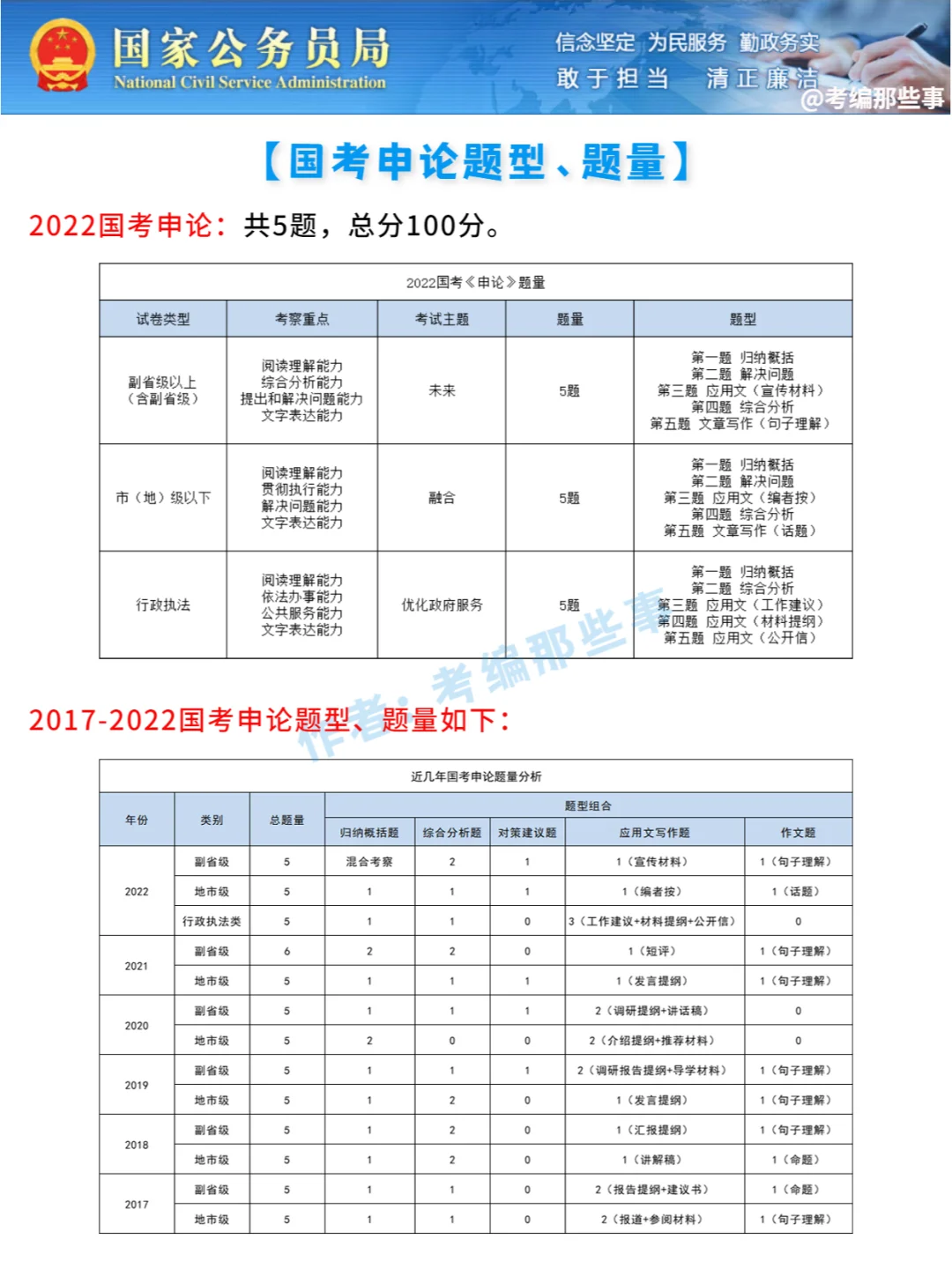 申论——总体题量都是5道题,副省级和地市级为4道小题和1道大作文,但2022年行政执法类的没考大作文,考察了应用文(撰写一封公开信),不但不代表今年不会考