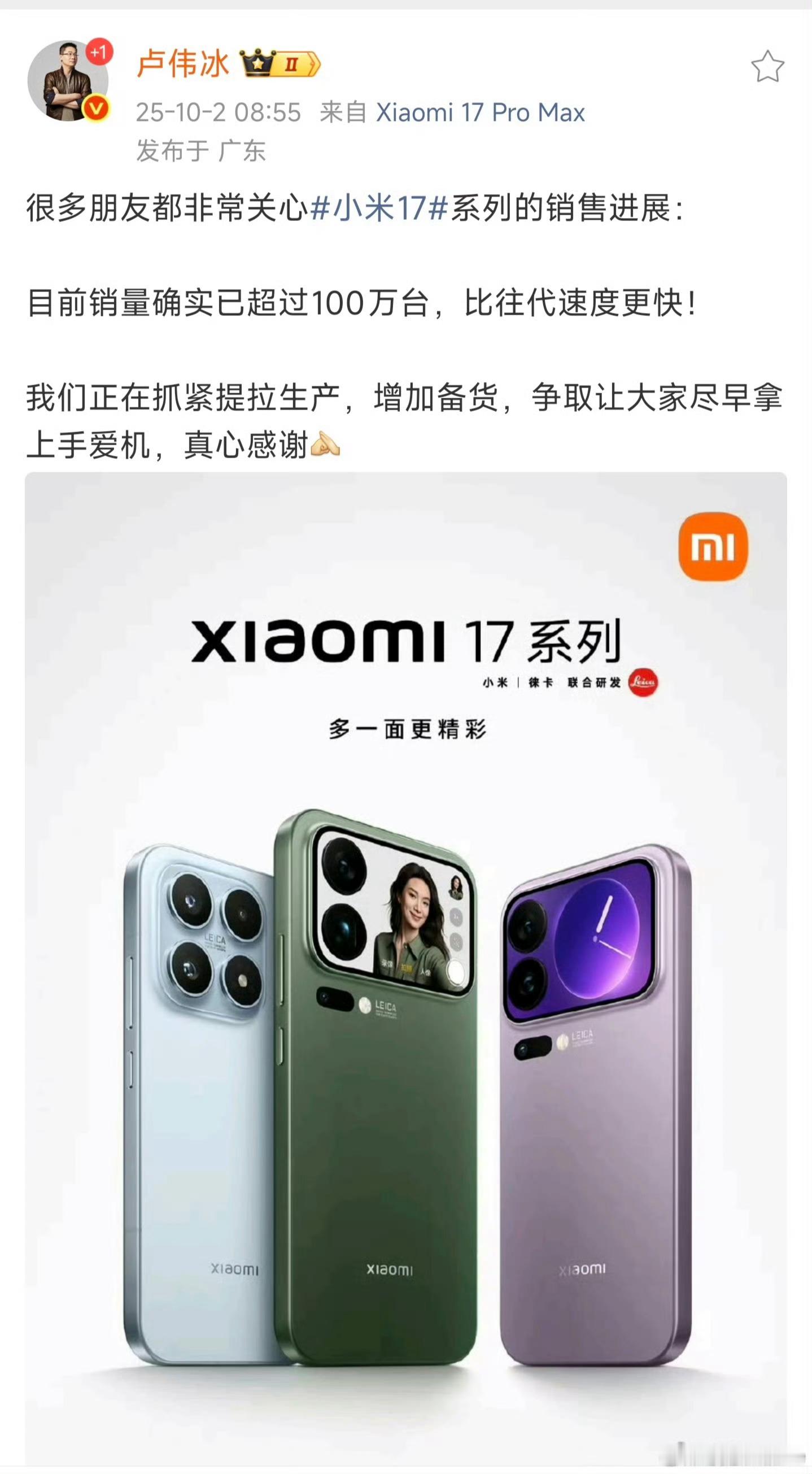 小米17系列五天销量破百万,八天半激活破百万,自从首销后,小米已经连续两周(W39-W40)登顶国内市场激活份额第一[good]。就像网友说的,这代虽然还是比不过苹果,但国内市场已经能打一打了。