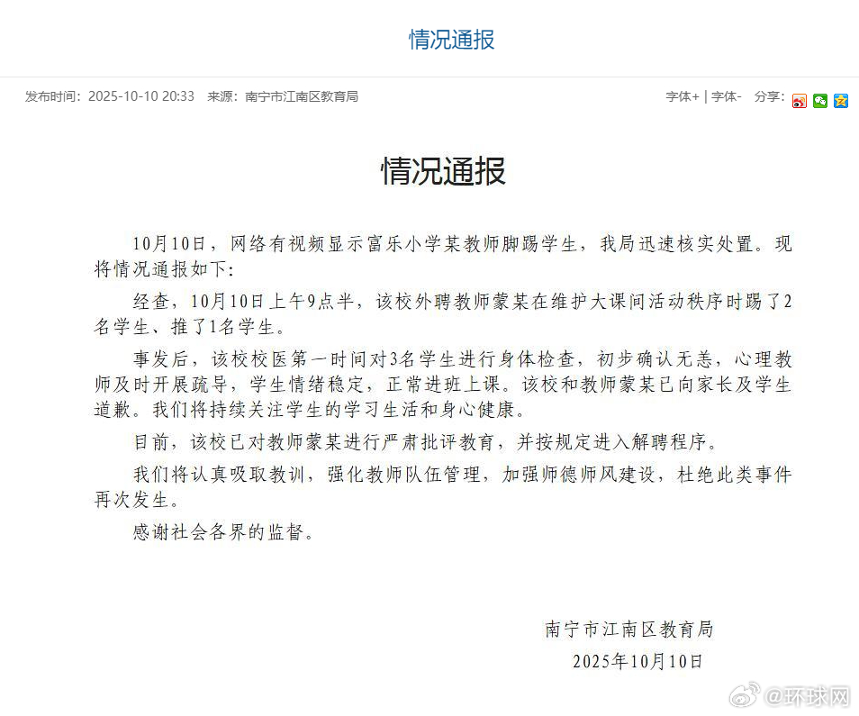 #南宁通报教师脚踢小学生#【南宁市江南区教育局通报“小学教师脚踢学生”:涉事教师进入解聘程序】