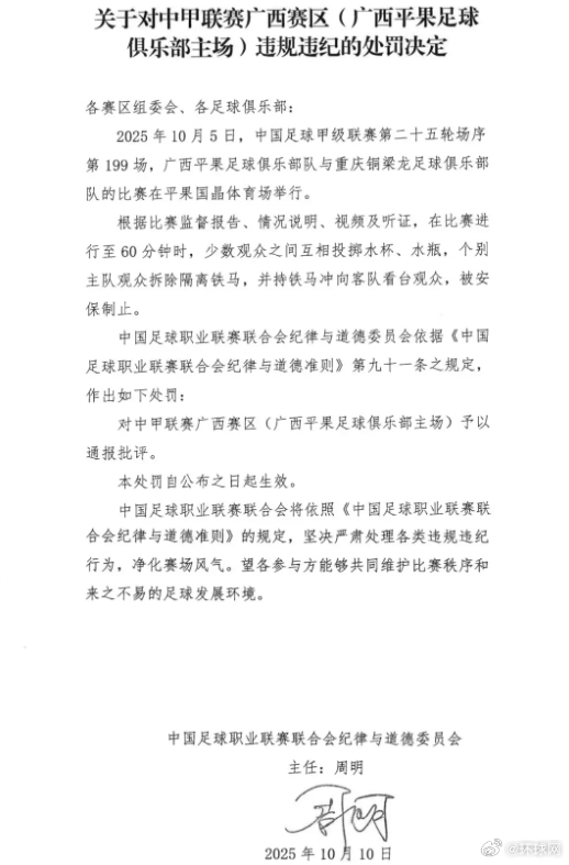 #中足联连开3张罚单#【中足联就广西平果队与重庆铜梁龙队比赛连发三份处罚决定】10月10日,中国足球职业联赛联合会(以下简称中足联)在官网针对10月5日本赛季中甲联赛第25轮广西平果队主场与重庆铜梁龙队比赛连续发布三份处罚决定。重庆铜梁龙队员黄希扬、广西平果队主教练前田浩二以及广西赛区(广西平果足球俱乐部主场)分别受到处罚。