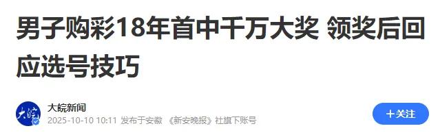 2025年10月9日,上海一男子坚持购彩18年,终于凭借一张花费252元的大乐透“9+2”复式票,中得1007万元一等奖。 该男子从大乐透刚推出时(24岁刚毕业)就开始购彩,多年来唯一的爱好就是坚持买彩。对于选号技巧,他称更倾向于购买复式票以提高中奖概率,但强调最重要的还是幸运和坚持——毕竟18年的坚守才等来这次“开花结果”。 这张彩票于9月20日开奖,因男子平时忙碌,直到国庆假期后才去领奖。网友纷纷感慨,有人羡慕他的幸运与坚持,也有人调侃“这就是命”,还有人对他“忙到延迟领奖”的心态表示佩服。