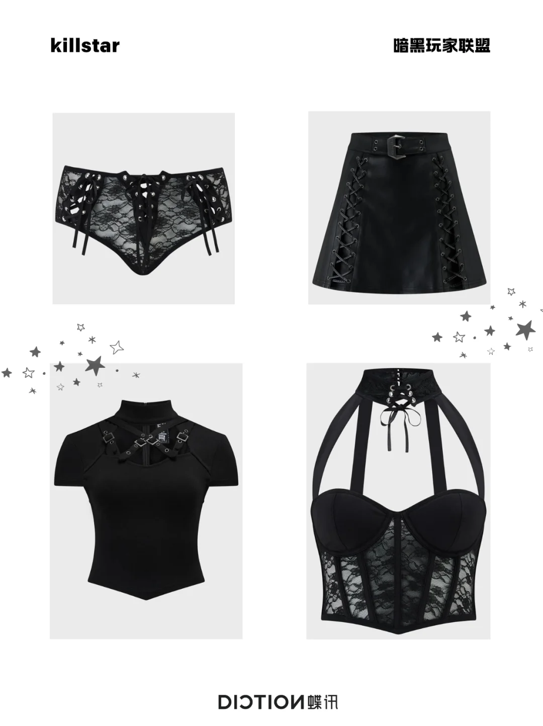 Kilstar 2025春夏延续品牌标志性的暗黑美学,为追求个性表达的消费者提供从日常到派对的全场景哥特风格解决方案。系列融合哥特浪漫主义与朋克反叛精神,打造兼具华丽与颓废的亚文化超级玩家外观。