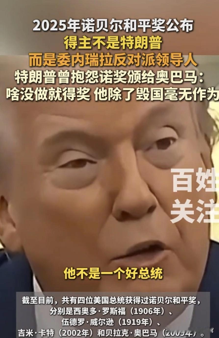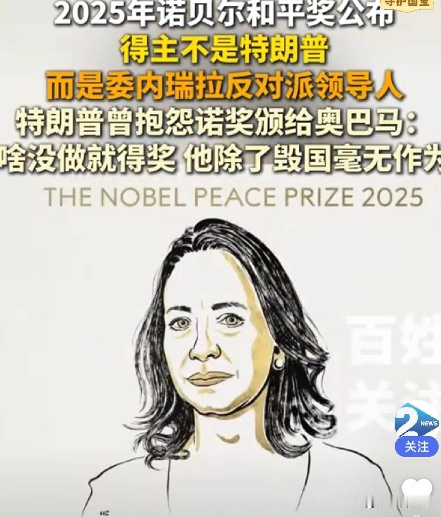 特朗普失望透顶!为了诺贝尔世界和平奖是白忙活了,2025年10月10日,诺贝尔和平奖已经揭晓,特朗普落选,获得此奖励的是委瑞内拉的玛丽亚·科里娜.马查多,特朗普感到自己非常“委屈”! 今年的诺贝尔和平奖备受关注,特朗普力求获得该奖项就是原因之一,但是说实话,除了特朗普自己,恐怕再也没有人对他能够获得该奖项有信心。 能够获得诺贝尔和平奖者,应该是对世界和平做出突出贡献的人,特朗普称自己制止了多场战争,就在诺贝尔和平奖宣布之前,特朗普还促成了“加沙停火”,因此,特朗普为了诺贝尔和平奖也算是“煞费苦心”。 委瑞内拉玛丽亚·科里娜.马查多能够获得该奖项,是因为她为委瑞内拉人民的民主权利做出突出贡献,委员认为,奖项如果给了特朗普会影响国家声誉,并且外界争议也不符合其获得该奖项。 对比,特朗普感到自己太“委屈”,甚至吐槽奥巴马只会毁了他们的国家,并不是个好总统,这是典型的“羡慕嫉妒恨”的心理。 木叔觉得,在这里必须为诺贝尔和平奖委员会成员点赞,他们秉持着这份荣誉的公正,把奖项给予了值得拥有的人。 特朗普在任期间,继续发挥美军“霸权手段”,引发的贸易战和美国直接或间接参与的战争有目共睹,他所谓的达成多个“停火协议”并非出自维护世界和平本心,更多是为自己创造和平奖“人为条件”或者是出自美国切身利益而为,而一个真正的爱好和平者,是绝不能掺杂私利的,就此,特朗普还需要自我纠正并做出努力。