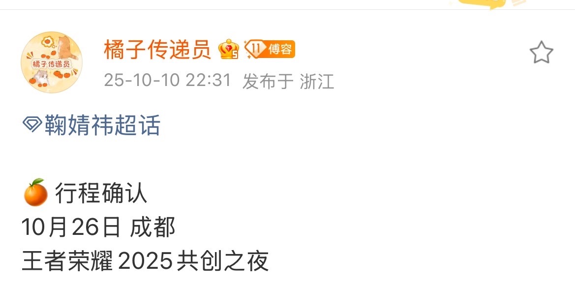 鞠婧祎新行程确认!10月26日参加在成都举办的王者荣耀2025共创之夜!期待鞠婧祎[憧憬]