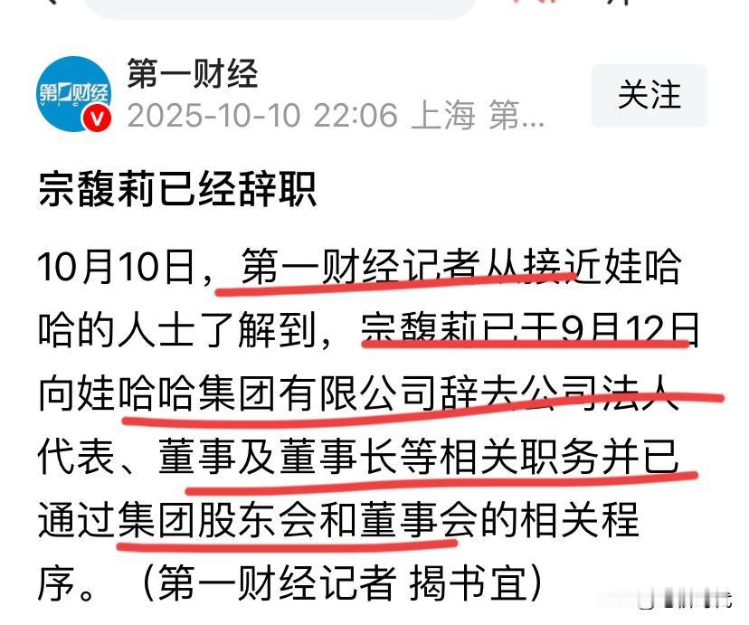 太意外!昨天还辟谣正常上班,宗馥莉居然已辞职了!直到今天才看到这消息,原来是这样。她已于9月12日向娃哈哈集团有限公司辞去公司法人代表、董事及董事长等相关职务并已通过集团股东会和董事会的相关程序。 短短数月,宗馥莉卸任消息如巨石入水,激起千层浪!从锐意改革的“铁娘子”到功成身退的背影,娃哈哈这艘巨轮即将驶向何方? 有人说辞去的是娃哈哈董事长,经营自己的娃小宗。摆脱枷锁,不一定是坏事。 不经他人苦,莫劝他人善,有多少人经历了宗馥莉所经历的?她这么做肯定有她的理由。 大众眼里可能是失去,也许是重生,轻装上阵一个崭新的商业帝国,何乐而不为呢?不想被老公司束缚,只想闯出一条属于自己的路! 希望她卸下重担后,能在新的旅程中获更多自由与快乐,也祝福娃哈哈继续走稳走好。 这场商业大剧,静候下一章高潮!