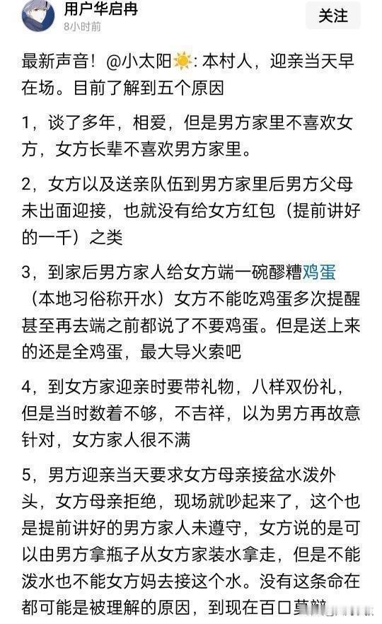 新郎跳河父亲再发声 想知道孩子跳河的原因 事情还没调查清楚 新郎父亲的话外音大家听出来了吗?连他都不知道儿子跳河的真正原因,是不是可以理解为他认为应该是女方导致的原因多,如果是自家的原因,那还等什么调查。 感觉图二的经过还算合理,新郎确实是被各种婚礼琐事压垮的,而且不是一天两天了,两人相处中就有矛盾,加上筹办婚礼,沟通中难免产生不同意见,让自己身心疲惫。 大家发现没,很多很小的事,一到了婚礼,就变成了大事,因为双方安排中任何的瑕疵就会被上升不爱,不尊重,忽视。让当事人放大为嫁错了人、娶错了人。这时候新娘提出要求,新郎家如果要满足就得和父母商量,父母如果不同意新郎也就成了小夹板,两头受气,还有男方女方如果有个别习俗不同,也会容易闹矛盾。 可是不管什么原因,新郎都已经走了,失去了最宝贵的生命,现在两家人也许都明白了,如果不那么计较有话好好说,是不是就不会发生这种悲剧了。