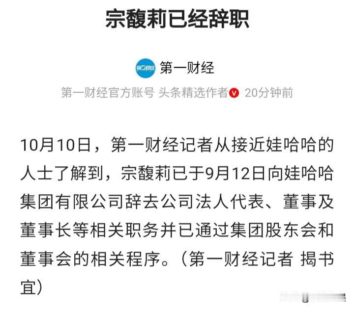 宗馥莉辞职了! 评论区网友却炸了锅? 最近作为娃哈哈集团的长公主宗馥莉已经辞去了娃哈哈集团有限公司的法人代表,董事以及董事长职务。没想到最终娃哈哈真正的娃宗馥莉还是输了。 而评论区网友也是对此表示不能理解,纷纷表示支持宗馥莉。