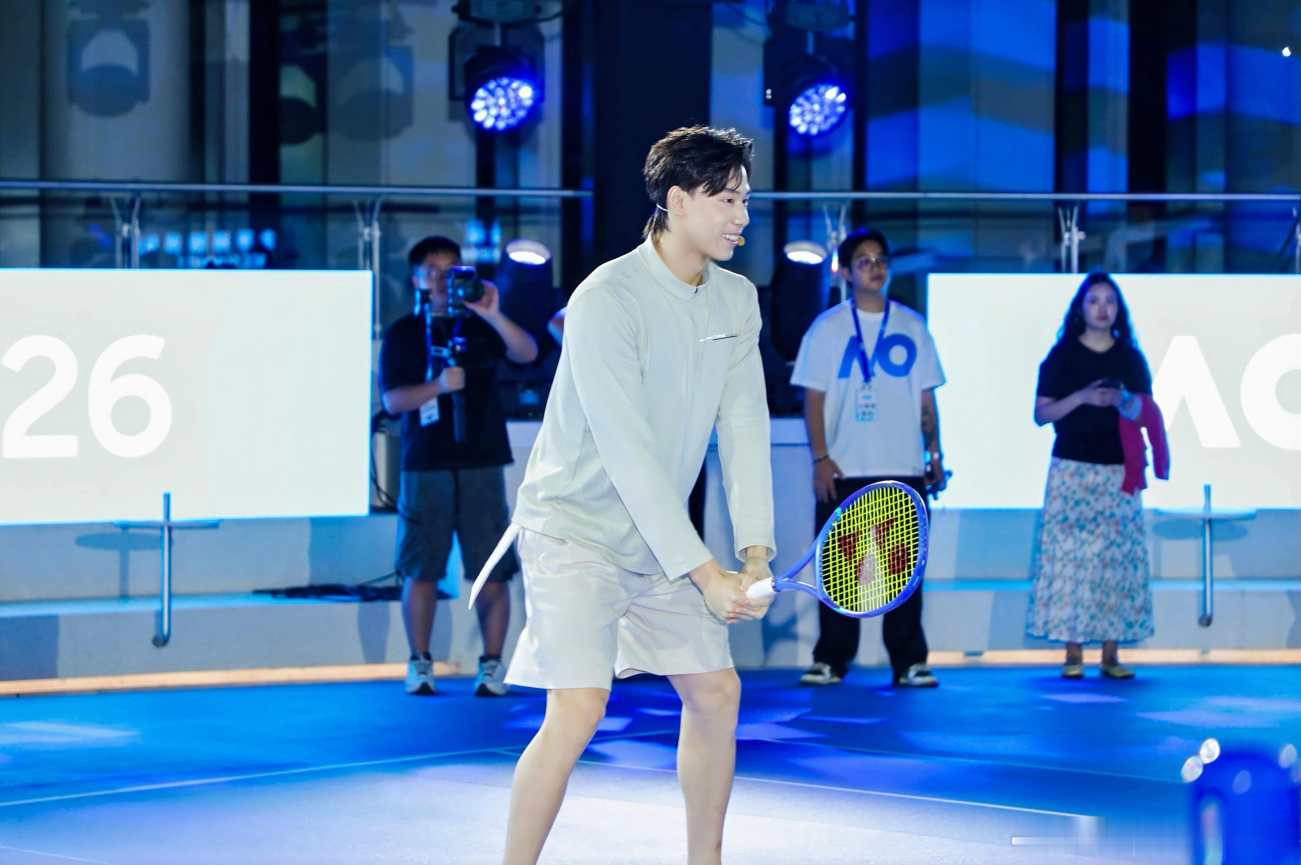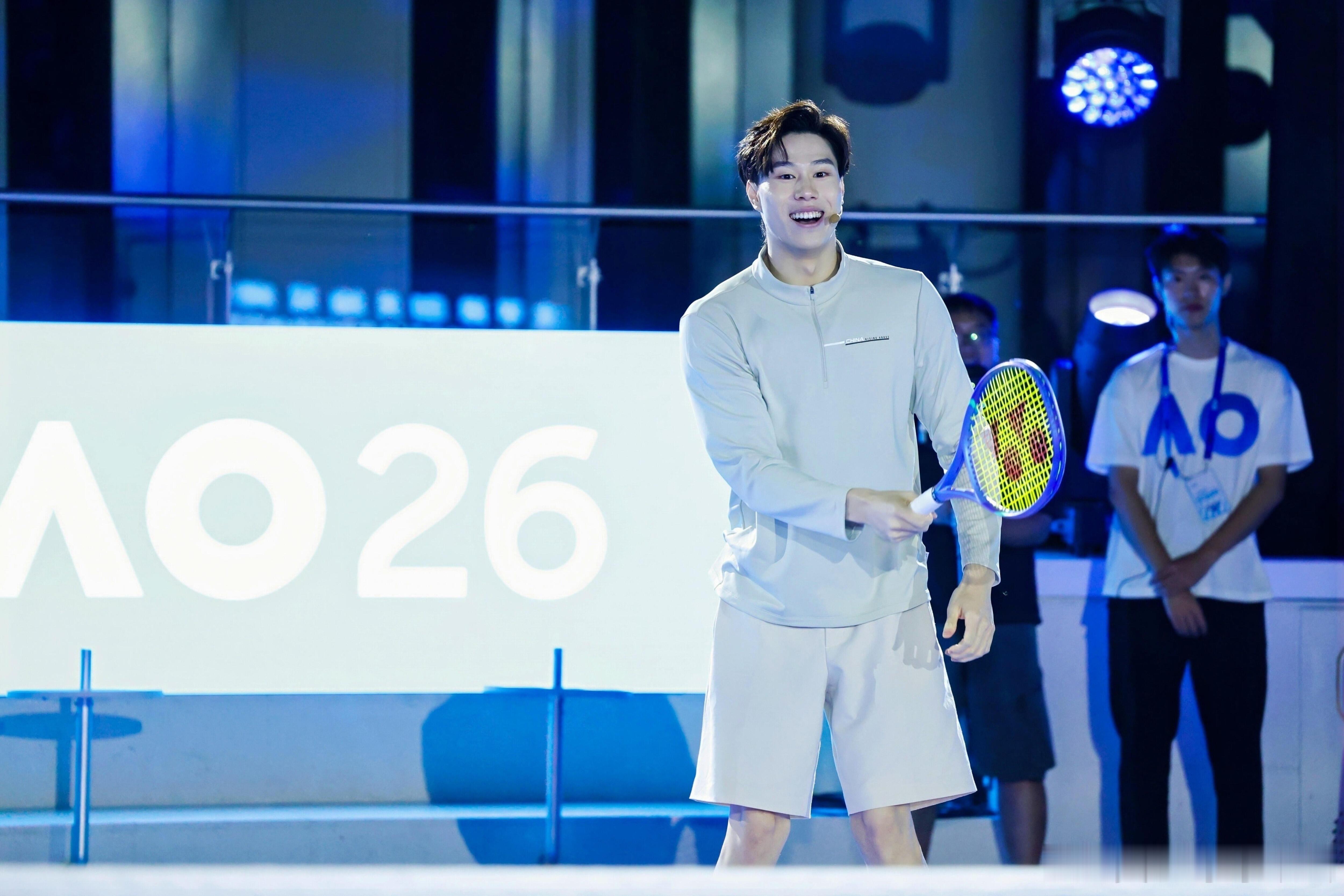 覃海洋在上海出席澳网2026中国发布会活动时,与好友张之臻进行了一场趣味网球对决。