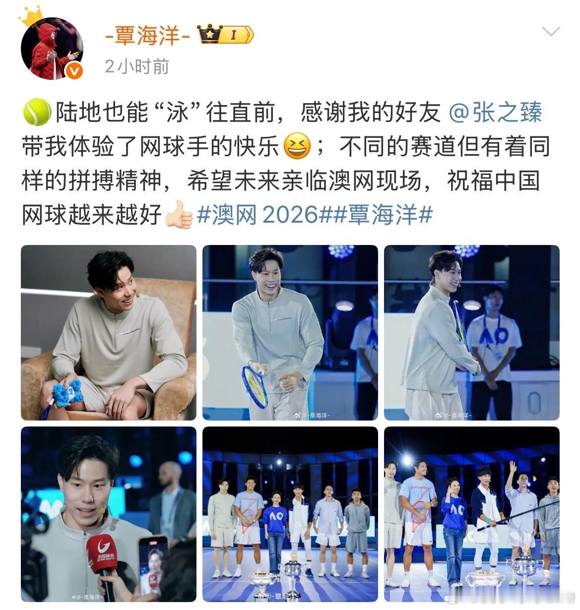 覃海洋参加澳网活动发文:不同的赛道但有着同样的拼搏精神,希望未来亲临澳网现场,祝福中国网球越来越好。